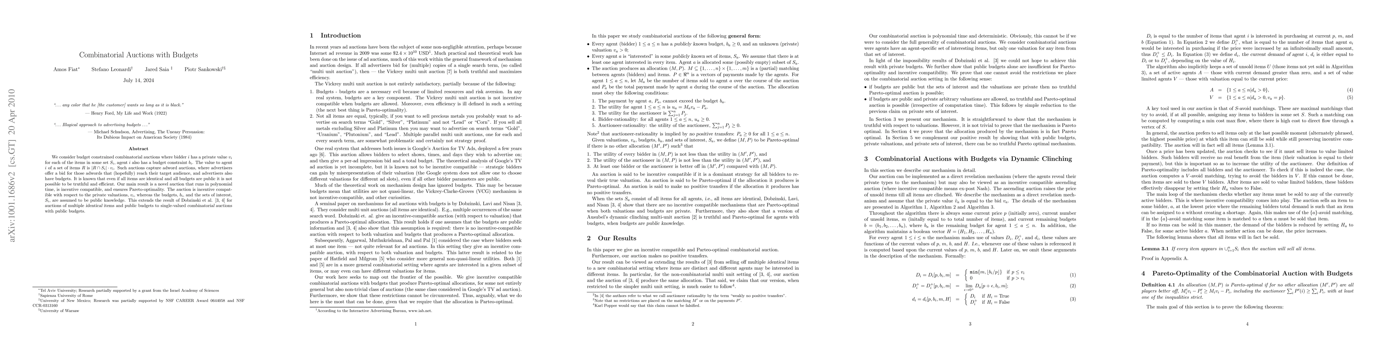 This paper proposes a novel polynomial-time combinatorial auction mechanism that is incentive compatible and Pareto-optimal for bidders with private values and public budgets, extending previous results for identical items to single-valued combinatorial auctions. The approach addresses the challenge of truthful and efficient auctions in scenarios like adword auctions.