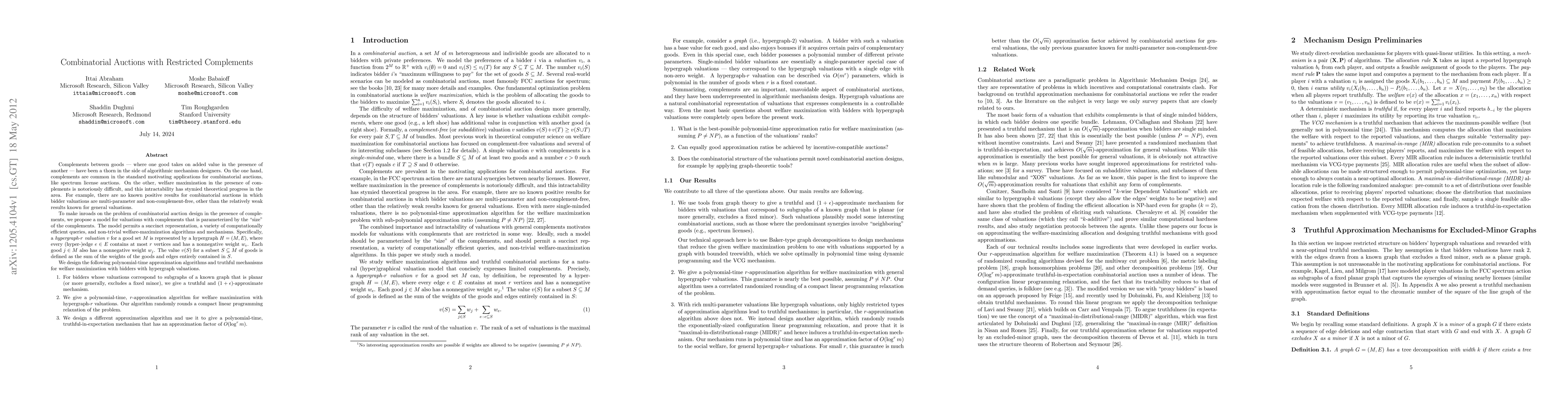 Complements between goods - where one good takes on added value in the presence of another - have been a thorn in the side of algorithmic mechanism designers. On the one hand, complements are common in the standard motivating applications for combinatorial auctions, like spectrum license auctions. On the other, welfare maximization in the presence of complements is notoriously difficult, and this intractability has stymied theoretical progress in the area. For example, there are no known positive results for combinatorial auctions in which bidder valuations are multi-parameter and non-complement-free, other than the relatively weak results known for general valuations. To make inroads on the problem of combinatorial auction design in the presence of complements, we propose a model for valuations with complements that is parameterized by the "size" of the complements. A valuation in our model is represented succinctly by a weighted hypergraph, where the size of the hyper-edges corresponds to degree of complementarity. Our model permits a variety of computationally efficient queries, and non-trivial welfare-maximization algorithms and mechanisms. We design the following polynomial-time approximation algorithms and truthful mechanisms for welfare maximization with bidders with hypergraph valuations. 1- For bidders whose valuations correspond to subgraphs of a known graph that is planar (or more generally, excludes a fixed minor), we give a truthful and (1+epsilon)-approximate mechanism. 2- We give a polynomial-time, r-approximation algorithm for welfare maximization with hypergraph-r valuations. Our algorithm randomly rounds a compact linear programming relaxation of the problem. 3- We design a different approximation algorithm and use it to give a polynomial-time, truthful-in-expectation mechanism that has an approximation factor of O(log^r m).