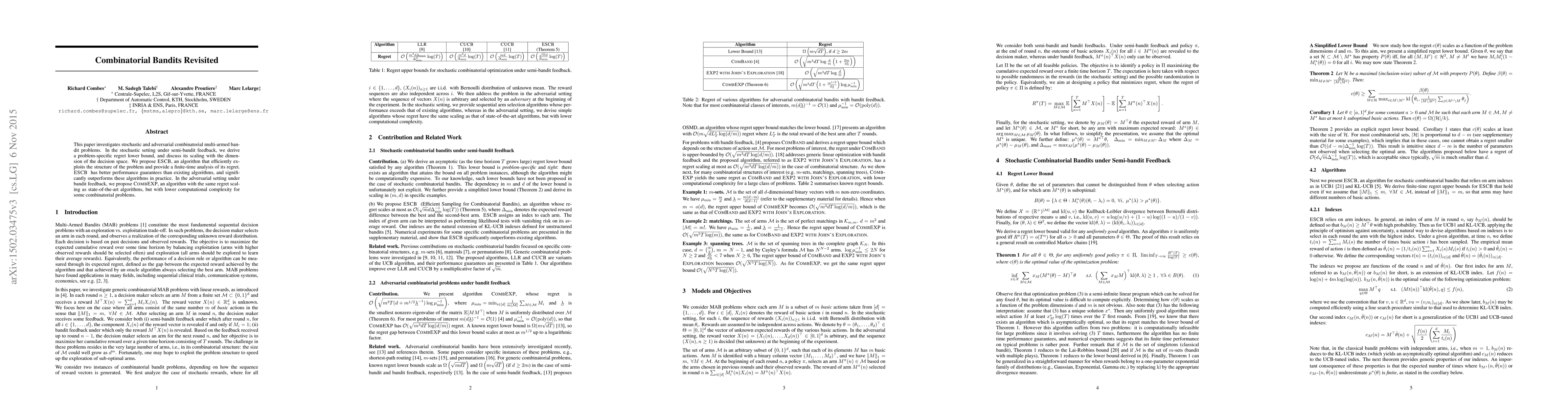 This paper investigates stochastic and adversarial combinatorial multi-armed bandit problems. In the stochastic setting under semi-bandit feedback, we derive a problem-specific regret lower bound, and discuss its scaling with the dimension of the decision space. We propose ESCB, an algorithm that efficiently exploits the structure of the problem and provide a finite-time analysis of its regret. ESCB has better performance guarantees than existing algorithms, and significantly outperforms these algorithms in practice. In the adversarial setting under bandit feedback, we propose \textsc{CombEXP}, an algorithm with the same regret scaling as state-of-the-art algorithms, but with lower computational complexity for some combinatorial problems.