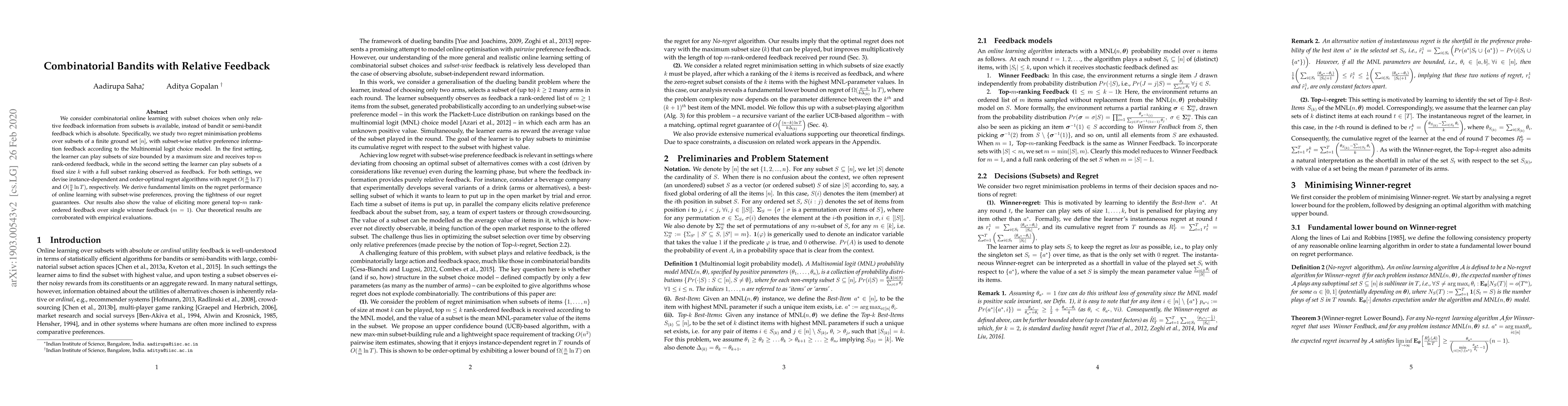 We consider combinatorial online learning with subset choices when only relative feedback information from subsets is available, instead of bandit or semi-bandit feedback which is absolute. Specifically, we study two regret minimisation problems over subsets of a finite ground set $[n]$, with subset-wise relative preference information feedback according to the Multinomial logit choice model. In the first setting, the learner can play subsets of size bounded by a maximum size and receives top-$m$ rank-ordered feedback, while in the second setting the learner can play subsets of a fixed size $k$ with a full subset ranking observed as feedback. For both settings, we devise instance-dependent and order-optimal regret algorithms with regret $O(\frac{n}{m} \ln T)$ and $O(\frac{n}{k} \ln T)$, respectively. We derive fundamental limits on the regret performance of online learning with subset-wise preferences, proving the tightness of our regret guarantees. Our results also show the value of eliciting more general top-$m$ rank-ordered feedback over single winner feedback ($m=1$). Our theoretical results are corroborated with empirical evaluations.