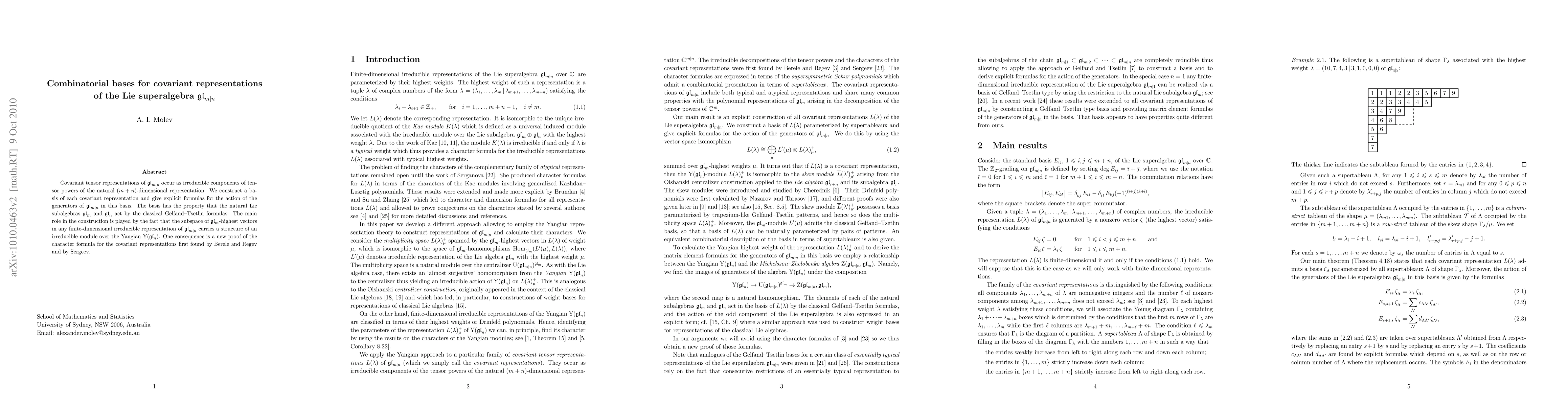 This paper constructs a combinatorial basis for covariant representations of the Lie superalgebra gl(m|n), providing explicit formulas for the action of its generators. The basis allows gl(m) and gl(n) to act via the classical Gelfand-Tsetlin formulas, leveraging the structure of irreducible modules over the Yangian Y(gl(n)).
