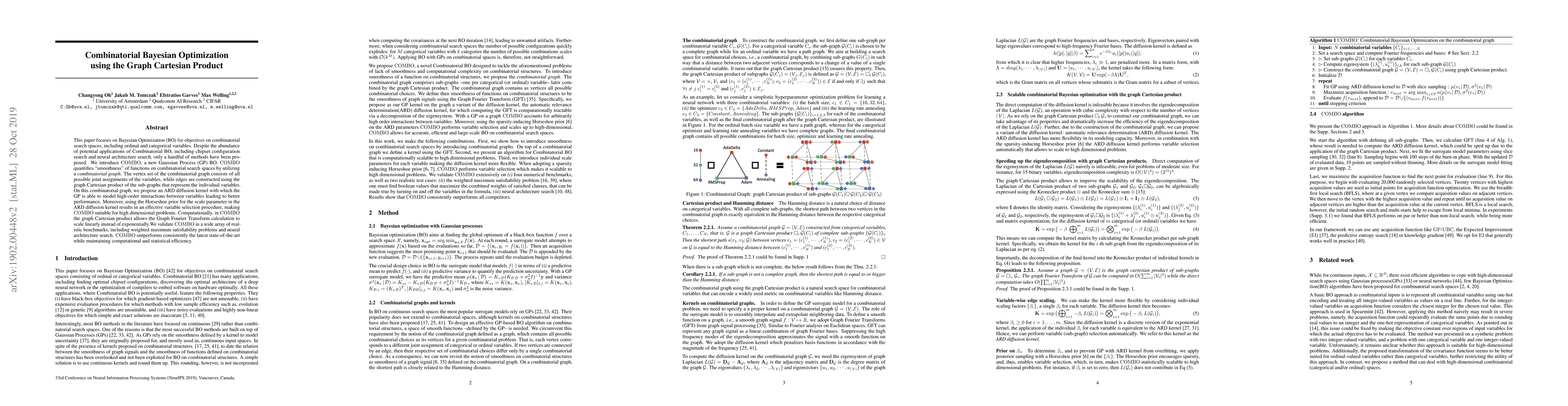 This paper focuses on Bayesian Optimization (BO) for objectives on combinatorial search spaces, including ordinal and categorical variables. Despite the abundance of potential applications of Combinatorial BO, including chipset configuration search and neural architecture search, only a handful of methods have been proposed. We introduce COMBO, a new Gaussian Process (GP) BO. COMBO quantifies "smoothness" of functions on combinatorial search spaces by utilizing a combinatorial graph. The vertex set of the combinatorial graph consists of all possible joint assignments of the variables, while edges are constructed using the graph Cartesian product of the sub-graphs that represent the individual variables. On this combinatorial graph, we propose an ARD diffusion kernel with which the GP is able to model high-order interactions between variables leading to better performance. Moreover, using the Horseshoe prior for the scale parameter in the ARD diffusion kernel results in an effective variable selection procedure, making COMBO suitable for high dimensional problems. Computationally, in COMBO the graph Cartesian product allows the Graph Fourier Transform calculation to scale linearly instead of exponentially. We validate COMBO in a wide array of realistic benchmarks, including weighted maximum satisfiability problems and neural architecture search. COMBO outperforms consistently the latest state-of-the-art while maintaining computational and statistical efficiency.