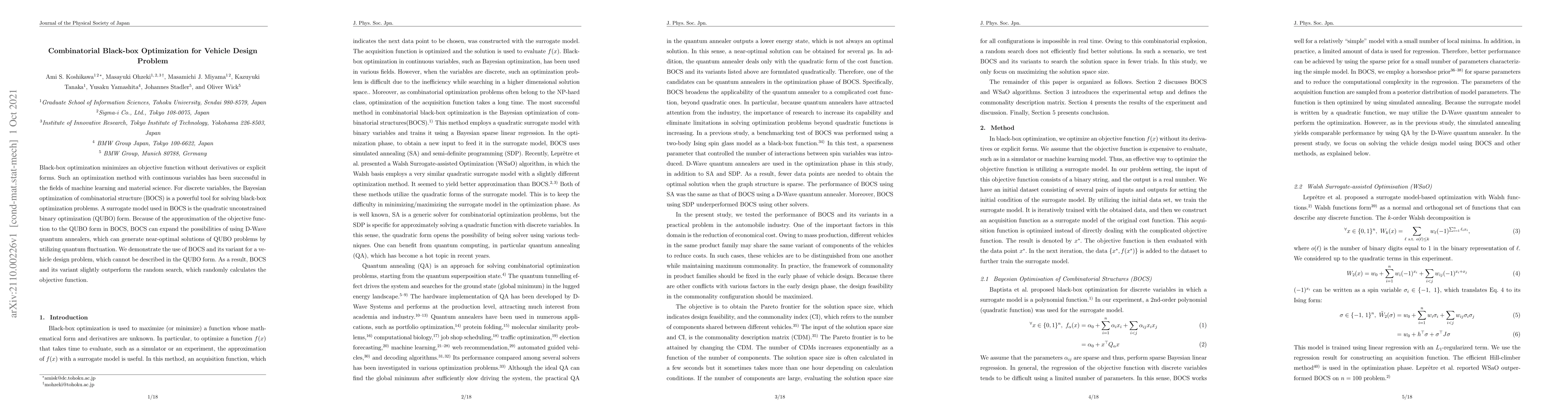 Black-box optimization minimizes an objective function without derivatives or explicit forms. Such an optimization method with continuous variables has been successful in the fields of machine learning and material science. For discrete variables, the Bayesian optimization of combinatorial structure (BOCS) is a powerful tool for solving black-box optimization problems. A surrogate model used in BOCS is the quadratic unconstrained binary optimization (QUBO) form. Because of the approximation of the objective function to the QUBO form in BOCS, BOCS can expand the possibilities of using D-Wave quantum annealers, which can generate near-optimal solutions of QUBO problems by utilizing quantum fluctuation. We demonstrate the use of BOCS and its variant for a vehicle design problem, which cannot be described in the QUBO form. As a result, BOCS and its variant slightly outperform the random search, which randomly calculates the objective function.