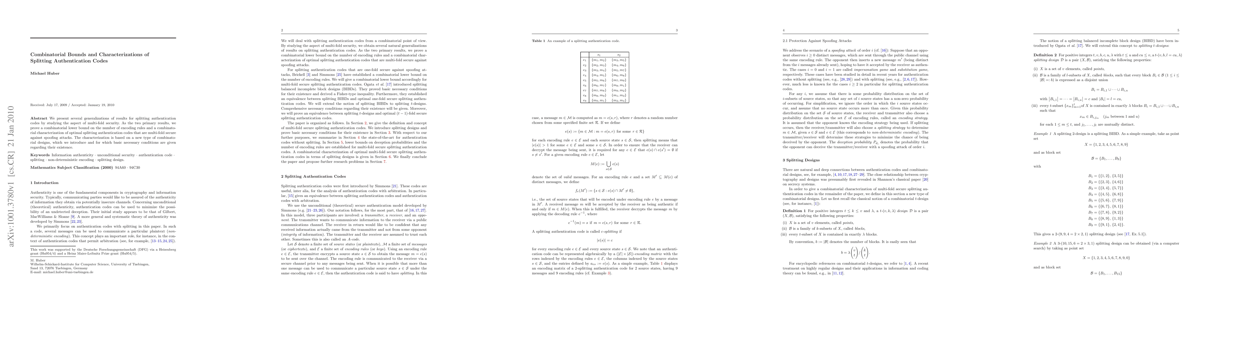 New results generalize splitting authentication codes to multi-fold security, establishing lower bounds on encoding rules and characterizing optimal codes through new combinatorial designs.