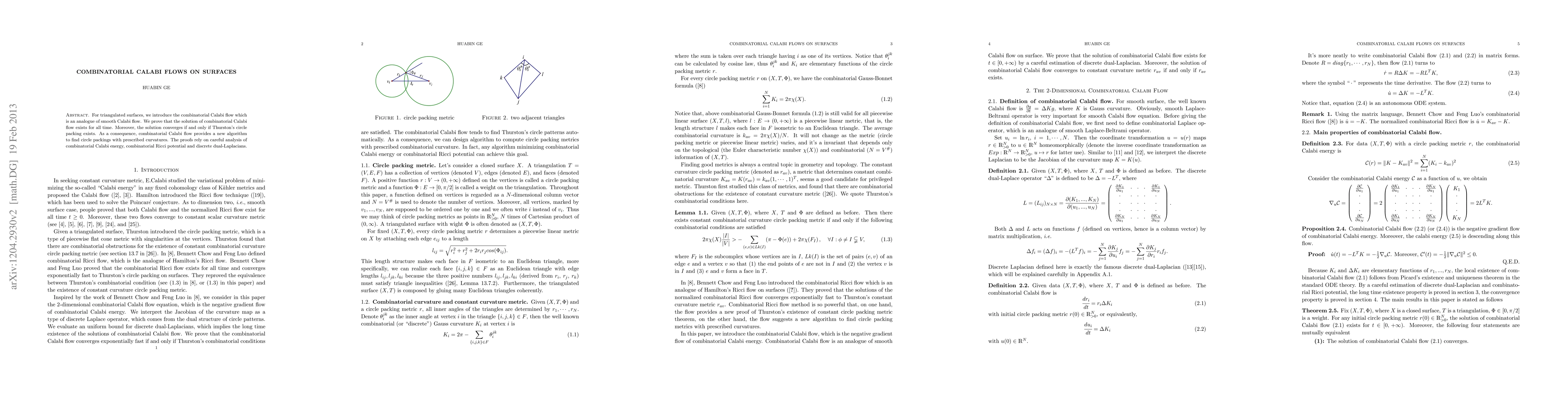 This paper introduces a combinatorial analogue of the smooth Calabi flow for triangulated surfaces, proving its existence and convergence conditions tied to Thurston's circle packing. It offers a new algorithm for finding circle packings with specified curvatures based on the analysis of combinatorial Calabi energy, Ricci potential, and discrete dual-Laplacians.