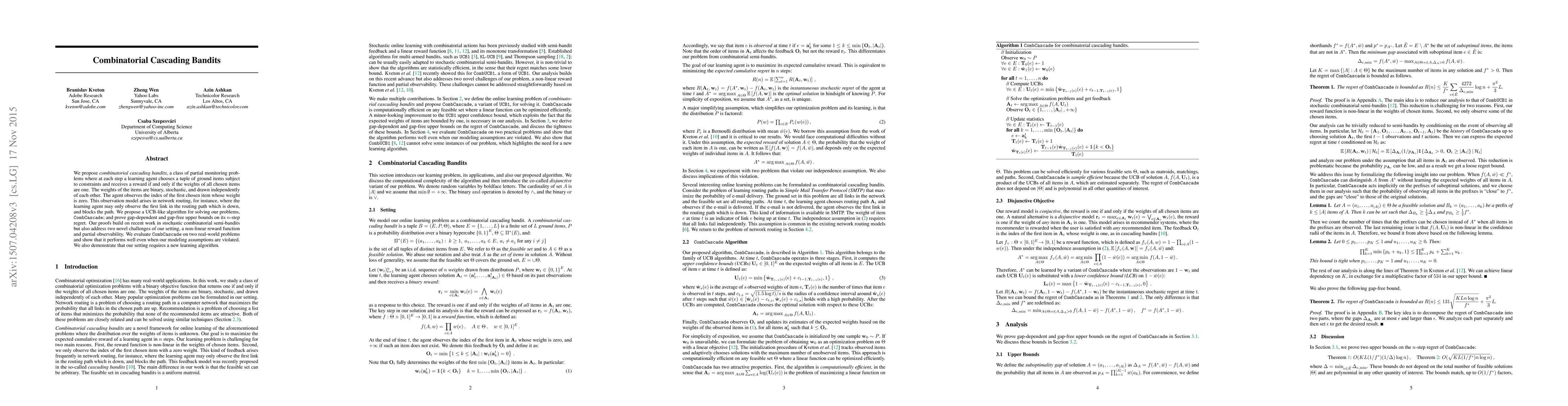Researchers propose a new algorithm called CombCascade for solving combinatorial cascading bandit problems, where an agent chooses items subject to constraints and receives rewards based on item weights, with novel challenges including non-linear reward functions and partial observability. The algorithm is shown to perform well even when assumptions are violated.