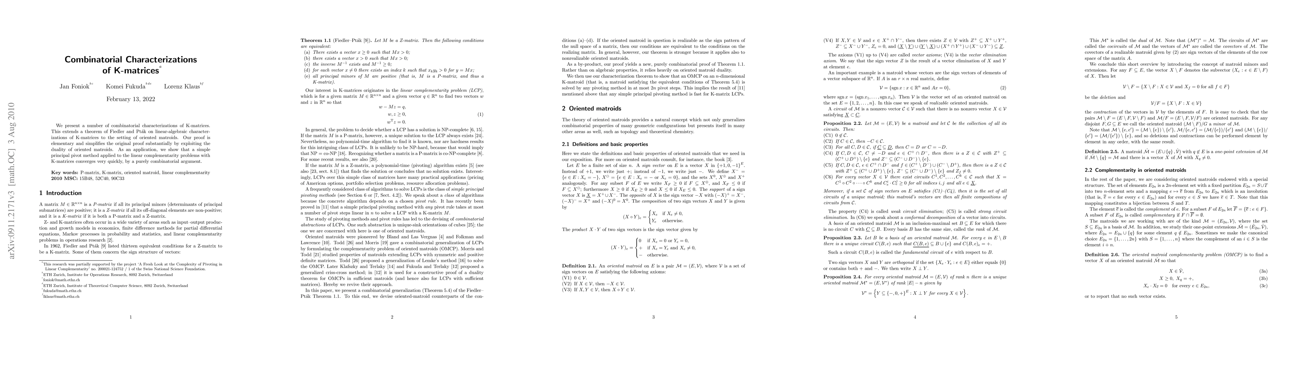 This research provides combinatorial characterizations of K-matrices, extending previous linear-algebraic theorems to oriented matroids using their duality. It simplifies original proofs and demonstrates a rapid convergence of a principal pivot method for linear complementarity problems involving K-matrices through a purely combinatorial argument.