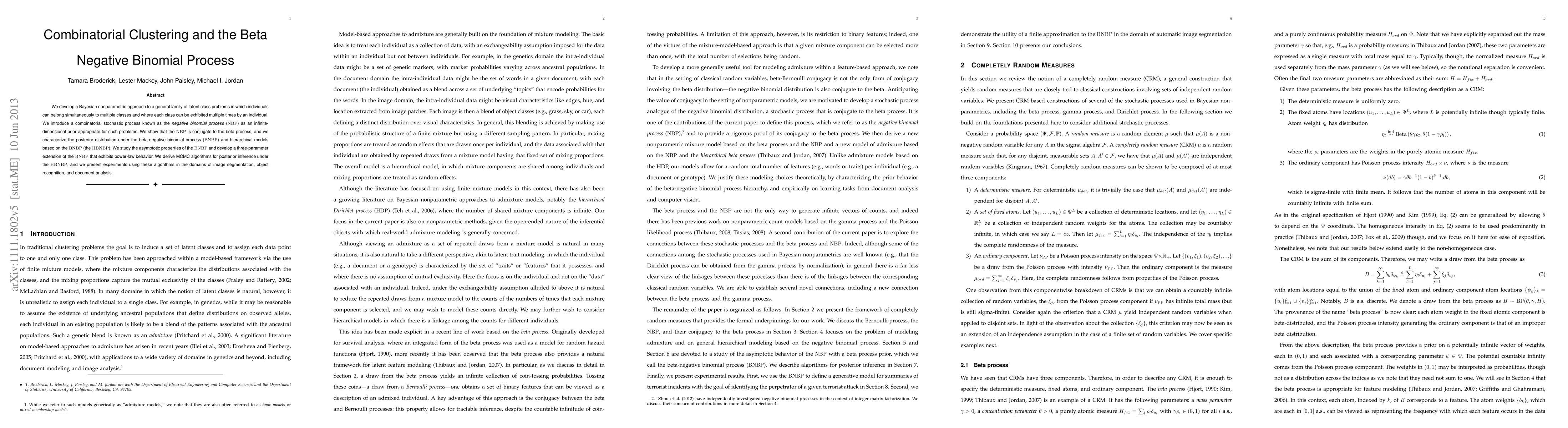 This paper proposes a Bayesian nonparametric method for combinatorial clustering using the beta negative binomial process (BNBP). The authors develop MCMC algorithms for posterior inference and demonstrate its application in image segmentation, object recognition, and document analysis.