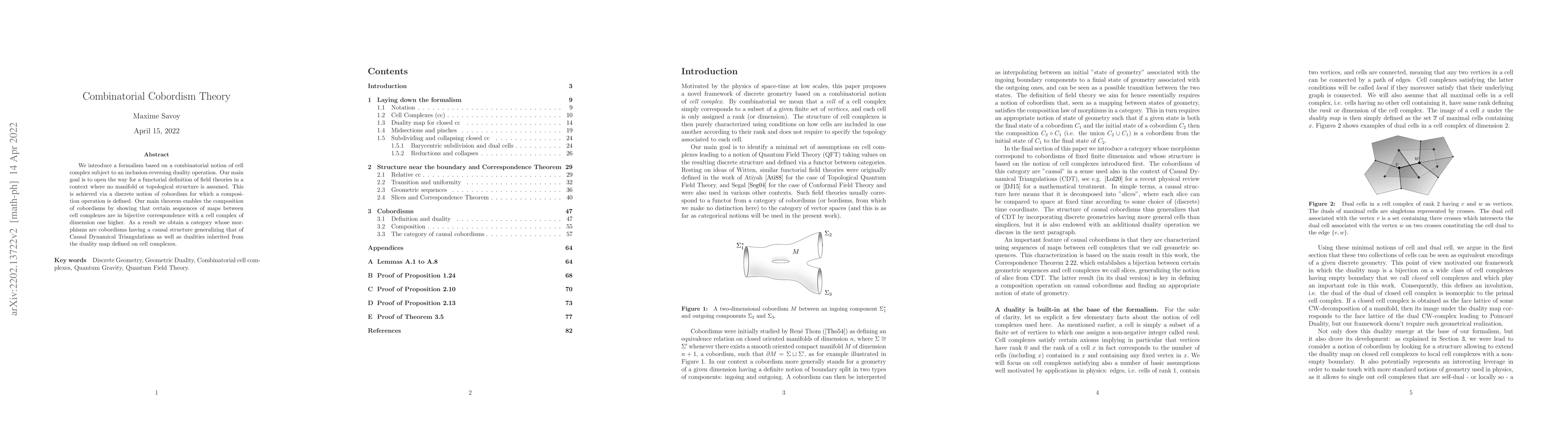 The paper proposes a combinatorial approach to cobordism theory, using cell complexes and an inclusion-reversing duality operation to define a functorial framework for field theories without relying on manifolds or topological structures. The key result is a theorem that enables the composition of cobordisms through a bijective correspondence between maps of cell complexes and a higher-dimensional cell complex, resulting in a category of cobordisms with a generalized causal structure.