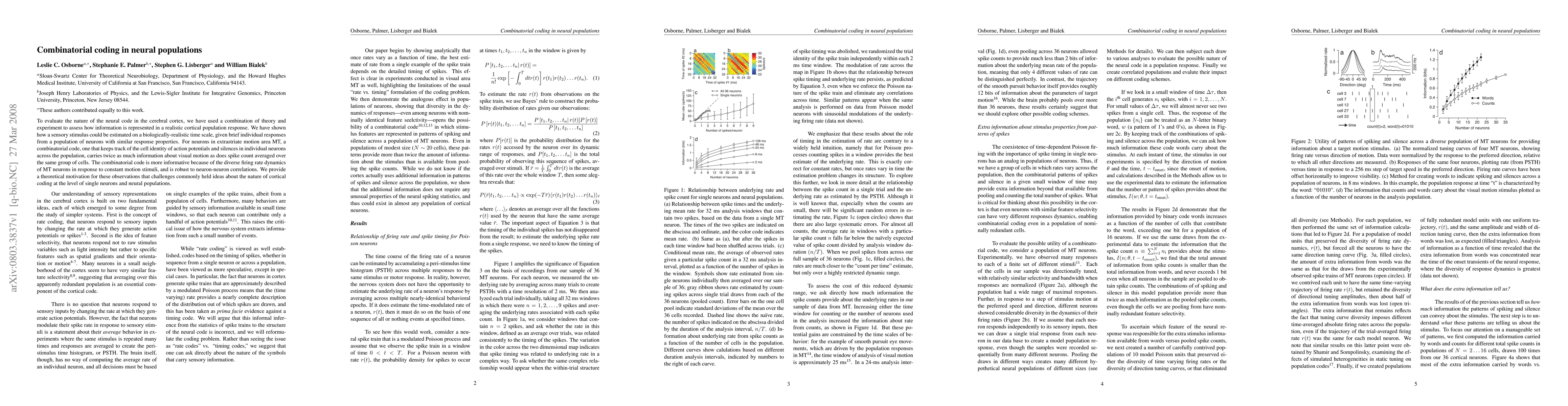 This research demonstrates that a combinatorial code in neural populations, which considers both the identity of active neurons and their silences, provides twice the information about visual motion compared to traditional spike count methods. This finding challenges conventional views on cortical coding and highlights the importance of diverse firing dynamics in neural responses.