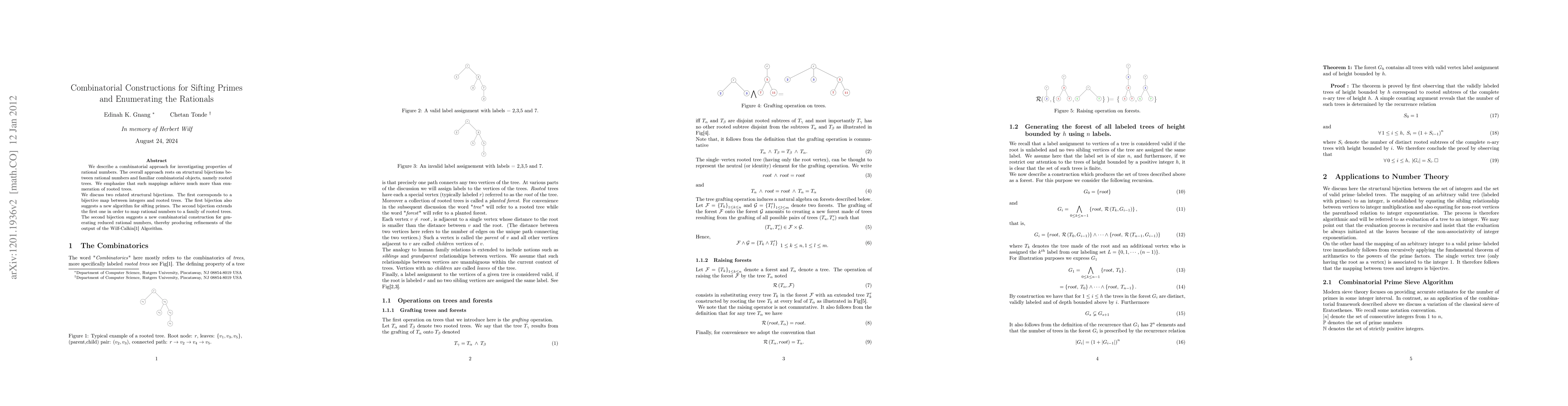 We describe a combinatorial approach for investigating properties of rational numbers. The overall approach rests on structural bijections between rational numbers and familiar combinatorial objects, namely rooted trees. We emphasize that such mappings achieve much more than enumeration of rooted trees. We discuss two related structural bijections. The first corresponds to a bijective map between integers and rooted trees. The first bijection also suggests a new algorithm for sifting primes. The second bijection extends the first one in order to map rational numbers to a family of rooted trees. The second bijection suggests a new combinatorial construction for generating reduced rational numbers, thereby producing refinements of the output of the Wilf-Calkin[1] Algorithm.