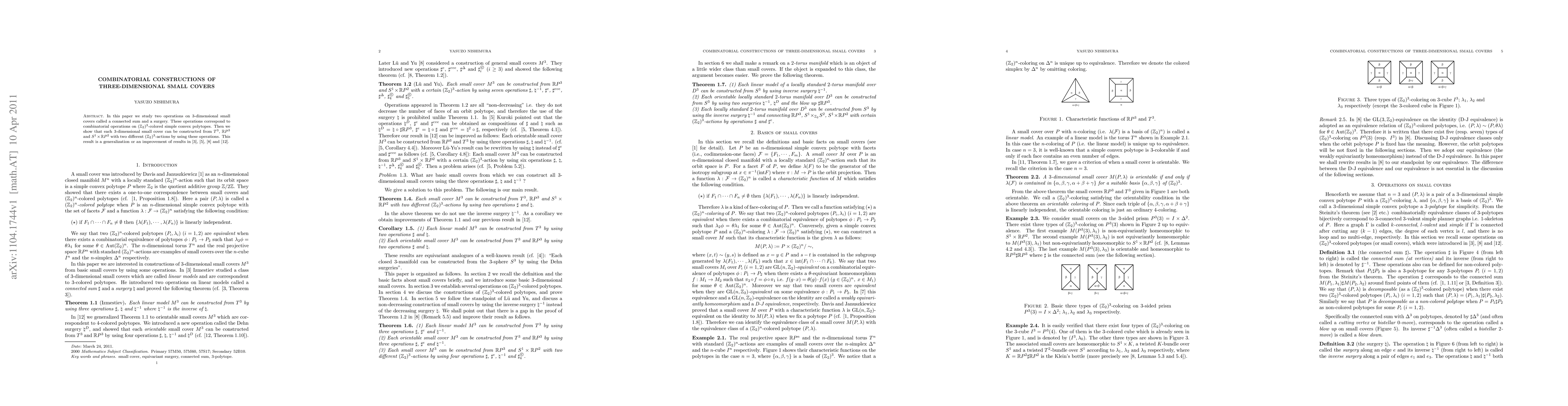 This paper explores the construction of 3-dimensional small covers using connected sum and surgery operations, corresponding to combinatorial operations on $(Z_2)^3$-colored polytopes. It demonstrates that any 3-dimensional small cover can be built from $T^3$, $RP^3$, and $S^1 \times RP^2$ with specific $(Z_2)^3$-actions, generalizing previous results.