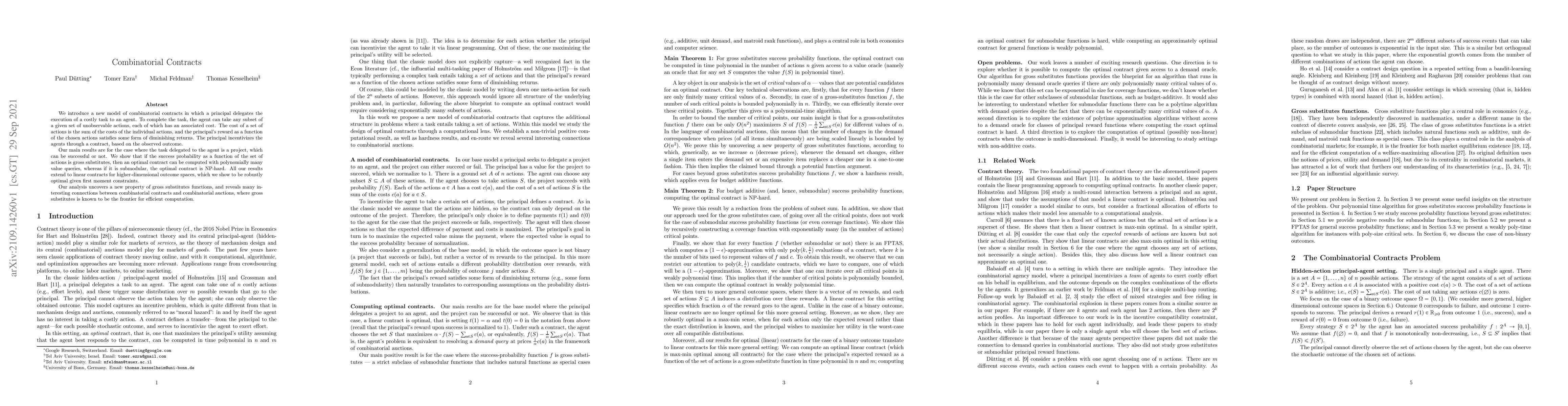 Researchers introduce a new model for combinatorial contracts, where an agent takes a subset of actions to complete a costly task. The paper shows that optimal contracts can be computed efficiently for certain functions, but become NP-hard for others.