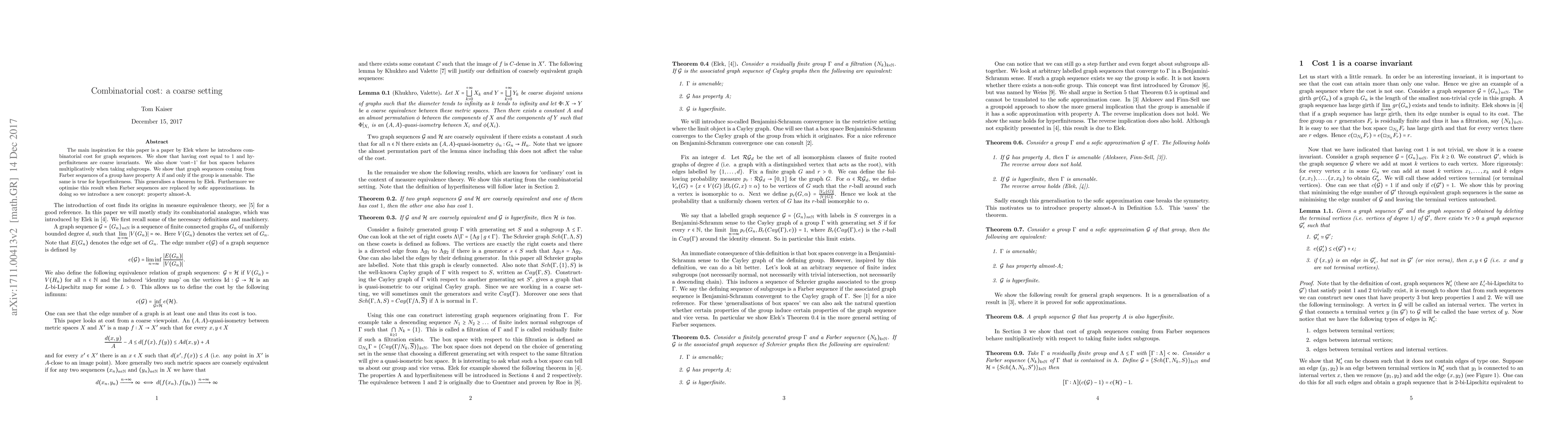 The main inspiration for this paper is a paper by Elek where he introduces combinatorial cost for graph sequences. We show that having cost equal to 1 and hyperfiniteness are coarse invariants. We also show `cost-1' for box spaces behaves multiplicatively when taking subgroups. We show that graph sequences coming from Farber sequences of a group have property A if and only if the group is amenable. The same is true for hyperfiniteness. This generalises a theorem by Elek. Furthermore we optimise this result when Farber sequences are replaced by sofic approximations. In doing so we introduce a new concept: property almost-A.