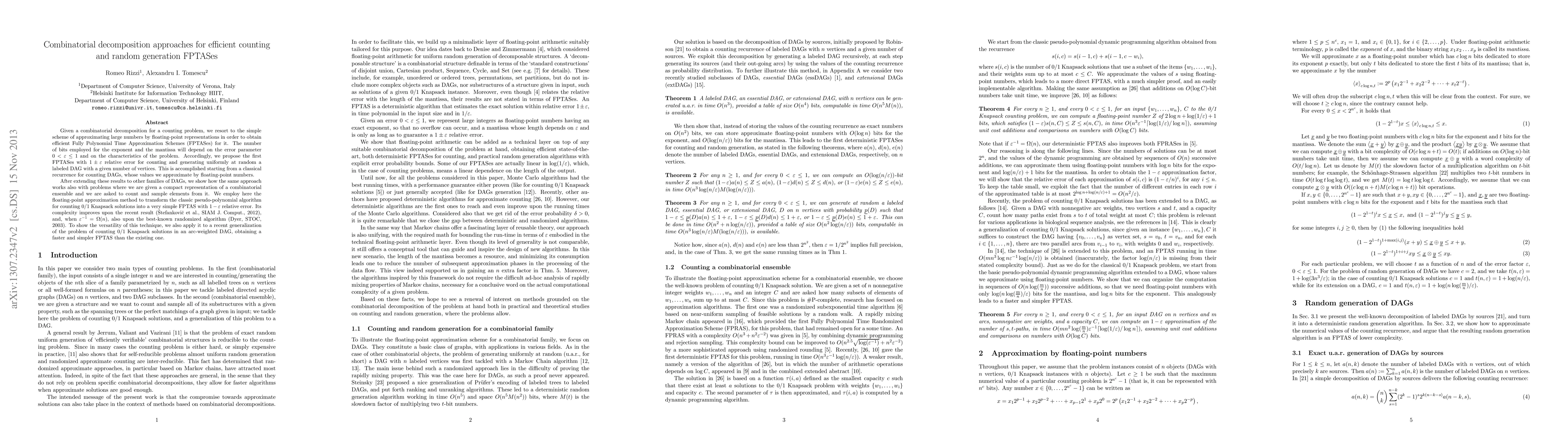 This paper proposes efficient Fully Polynomial Time Approximation Schemes (FPTASes) for counting and random generation in combinatorial problems using floating-point approximations. It introduces FPTASes with $1 \pm \varepsilon$ relative error for counting and generating labeled DAGs, and extends the method to other DAG families and combinatorial problems like the 0/1 Knapsack problem.