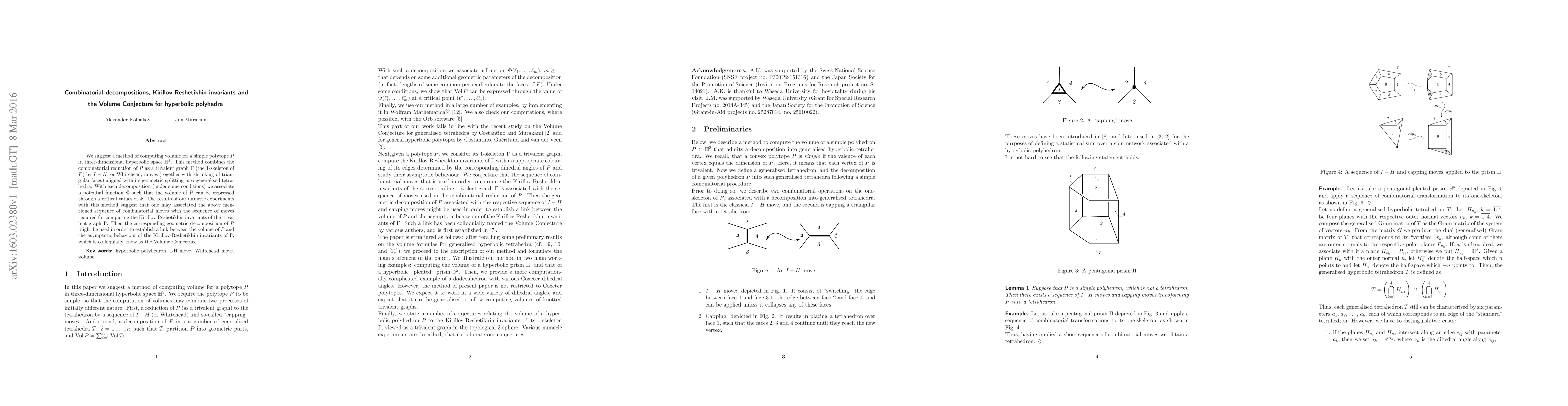 We suggest a method of computing volume for a simple polytope $P$ in three-dimensional hyperbolic space $\mathbb{H}^3$. This method combines the combinatorial reduction of $P$ as a trivalent graph $\Gamma$ (the $1$-skeleton of $P$) by $I-H$, or Whitehead, moves (together with shrinking of triangular faces) aligned with its geometric splitting into generalised tetrahedra. With each decomposition (under some conditions) we associate a potential function $\Phi$ such that the volume of $P$ can be expressed through a critical values of $\Phi$. The results of our numeric experiments with this method suggest that one may associated the above mentioned sequence of combinatorial moves with the sequence of moves required for computing the Kirillov-Reshetikhin invariants of the trivalent graph $\Gamma$. Then the corresponding geometric decomposition of $P$ might be used in order to establish a link between the volume of $P$ and the asymptotic behaviour of the Kirillov-Reshetikhin invariants of $\Gamma$, which is colloquially know as the Volume Conjecture.