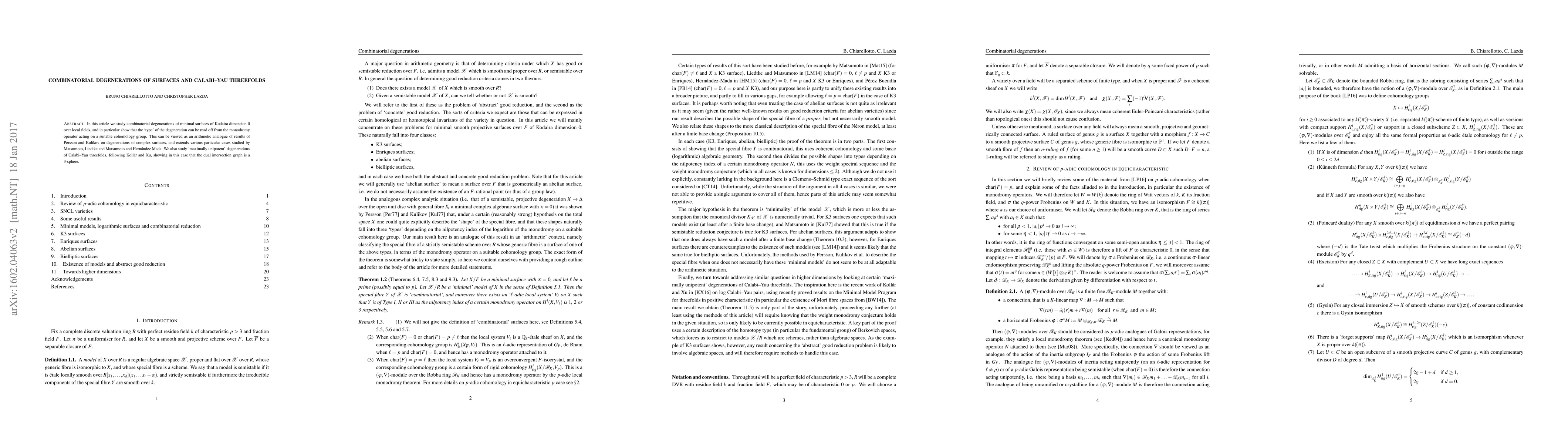 In this article we study combinatorial degenerations of minimal surfaces of Kodaira dimension 0 over local fields, and in particular show that the `type' of the degeneration can be read off from the monodromy operator acting on a suitable cohomology group. This can be viewed as an arithmetic analogue of results of Persson and Kulikov on degenerations of complex surfaces, and extends various particular cases studied by Matsumoto, Liedtke/Matsumoto and Hern\'andez-Mada. We also study `maximally unipotent' degenerations of Calabi--Yau threefolds, following Koll\'ar/Xu, showing in this case that the dual intersection graph is a 3-sphere.