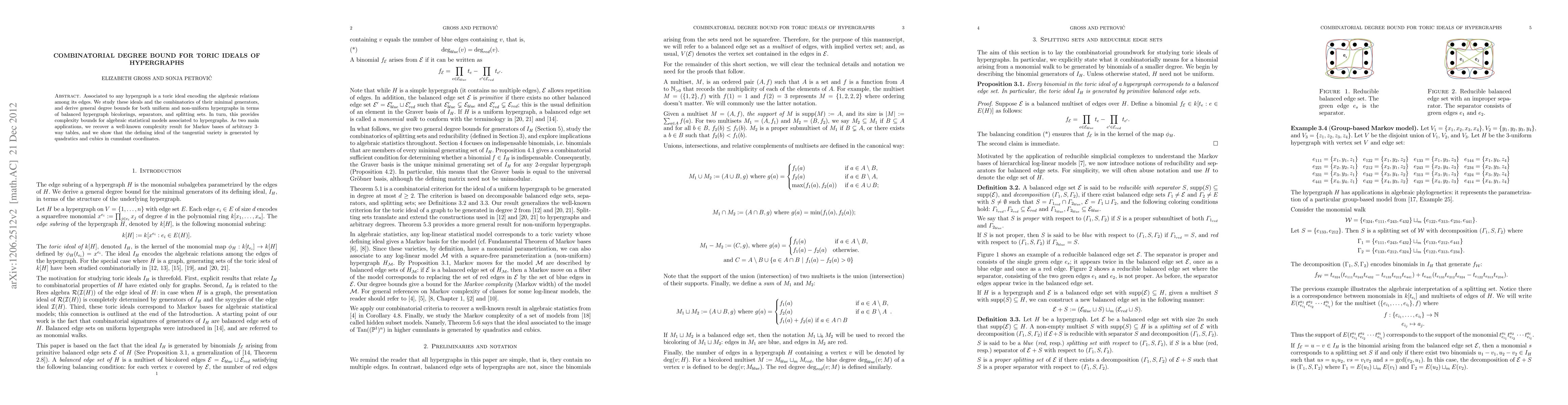 This paper establishes degree bounds for toric ideals associated with hypergraphs, using combinatorial structures like balanced bicolorings and separators. It applies these bounds to derive complexity results for Markov bases and tangential varieties, showing they are generated by quadratics and cubics in cumulant coordinates.