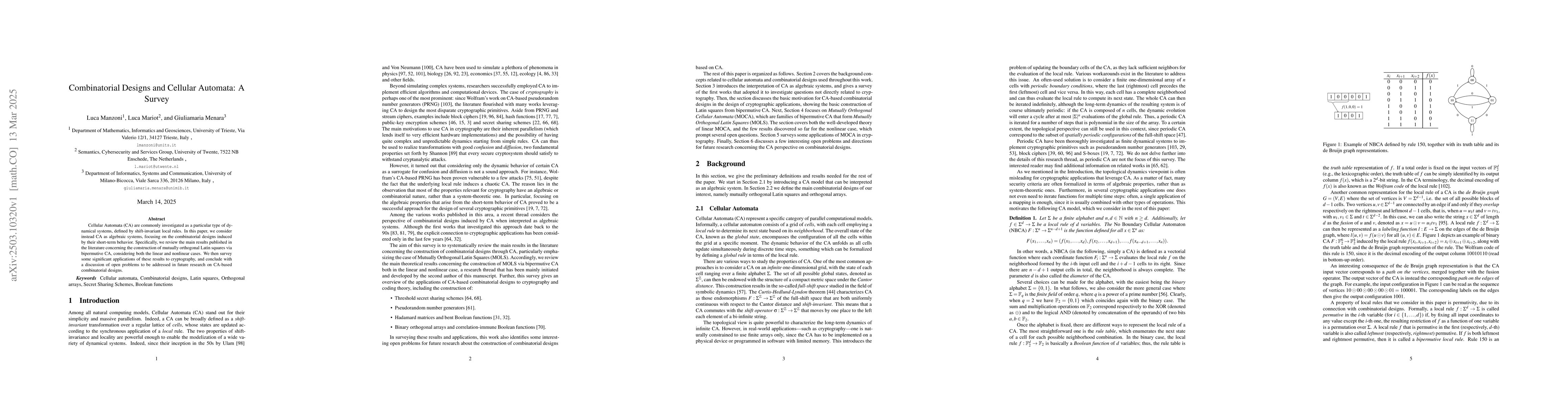 This work stands out by viewing Cellular Automata through the lens of combinatorial designs, rather than just dynamical systems, and by focusing on their algebraic properties, which opens new avenues for cryptographic research.