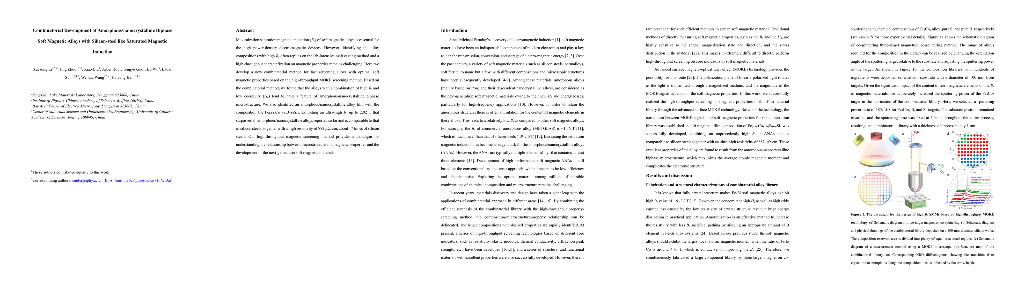 Maximization saturation magnetic induction (Bs) of soft magnetic alloys is essential for the high power-density electromagnetic devices. However, identifying the alloy compositions with high Bs often replies on the lab-intensive melt casting method and a high-throughput characterization on magnetic properties remains challenging. Here, we develop a new combinatorial method for fast screening alloys with optimal soft magnetic properties based on the high-throughput MOKE screening method. Based on the combinatorial method, we found that the alloys with a combination of high Bs and low coercivity (Hc) tend to have a feature of amorphous-nanocrystalline biphase microstructure. We also identified an amorphous/nanocrystalline alloy film with the composition the Fe68.09Co17.02B10.9Si4, exhibiting an ultra-high Bs up to 2.02 T that surpasses all amorphous/nanocrystalline alloys reported so far and is comparable to that of silicon steels, together with a high resistivity of 882 {\mu}{\Omega} {\dot} cm, about 17 times of silicon steels. Our high-throughput magnetic screening method provides a paradigm for understanding the relationship between microstructure and magnetic properties and the development of the next-generation soft magnetic materials.