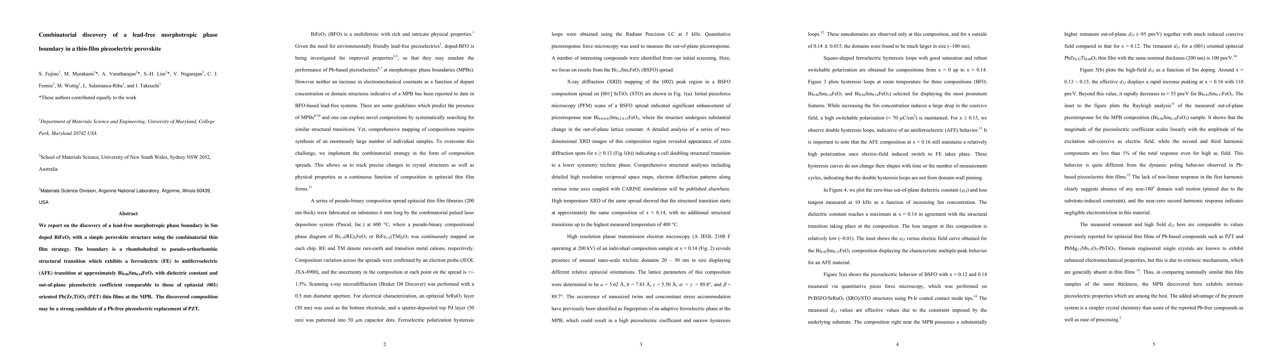 This paper reports the combinatorial discovery of a lead-free morphotropic phase boundary in Sm-doped BiFeO3 thin films, showcasing a ferroelectric to antiferroelectric transition with promising dielectric and piezoelectric properties comparable to Pb(Zr,Ti)O3, suggesting it as a potential lead-free piezoelectric material.