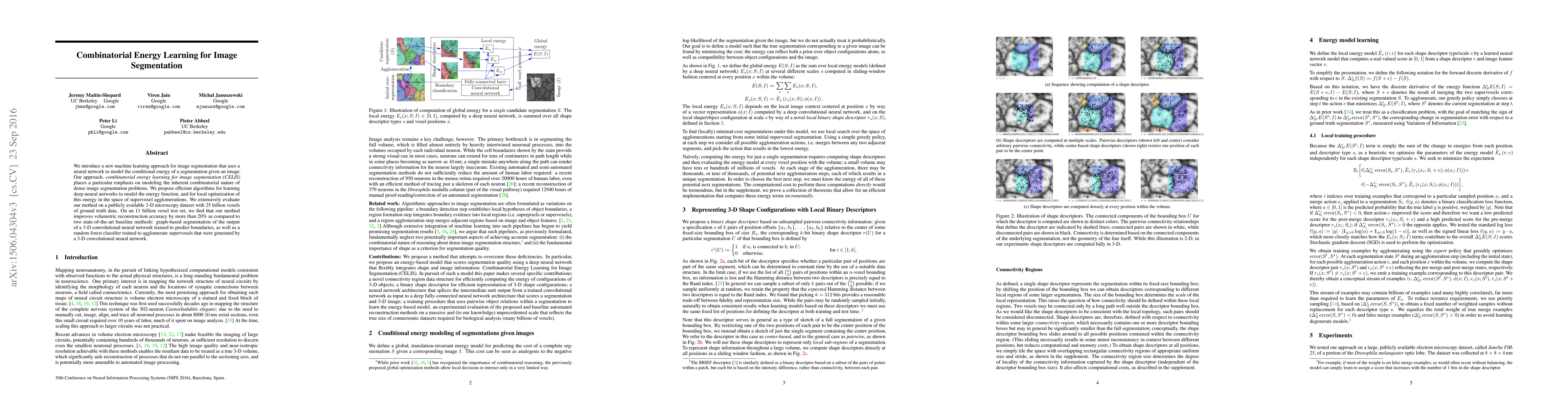 This paper introduces CELIS, a novel machine learning approach for image segmentation that models the conditional energy of segmentations using neural networks, emphasizing the combinatorial nature of dense segmentation problems. The method significantly improves volumetric reconstruction accuracy by over 20% compared to state-of-the-art baselines on a 3-D microscopy dataset.