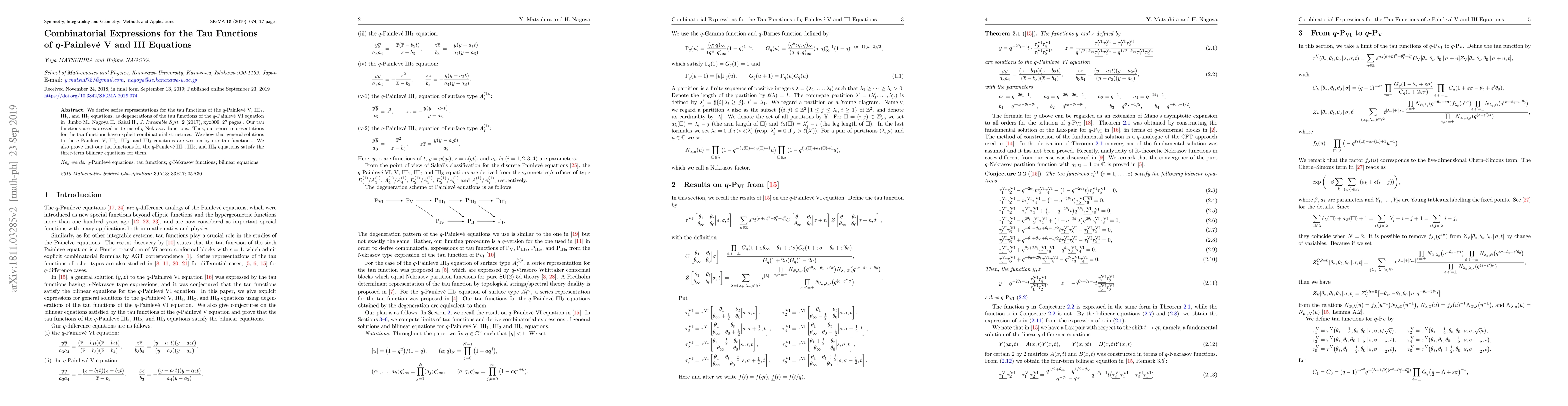 We derive series representations for the tau functions of the $q$-Painlev\'e V, $\mathrm{III_1}$, $\mathrm{III_2}$, and $\mathrm{III_3}$ equations, as degenerations of the tau functions of the $q$-Painlev\'e VI equation in [Jimbo M., Nagoya H., Sakai H., J. Integrable Syst. 2 (2017), xyx009, 27 pages]. Our tau functions are expressed in terms of $q$-Nekrasov functions. Thus, our series representations for the tau functions have explicit combinatorial structures. We show that general solutions to the $q$-Painlev\'e V, $\mathrm{III_1}$, $\mathrm{III_2}$, and $\mathrm{III_3}$ equations are written by our tau functions. We also prove that our tau functions for the $q$-Painlev\'e $\mathrm{III_1}$, $\mathrm{III_2}$, and $\mathrm{III_3}$ equations satisfy the three-term bilinear equations for them.