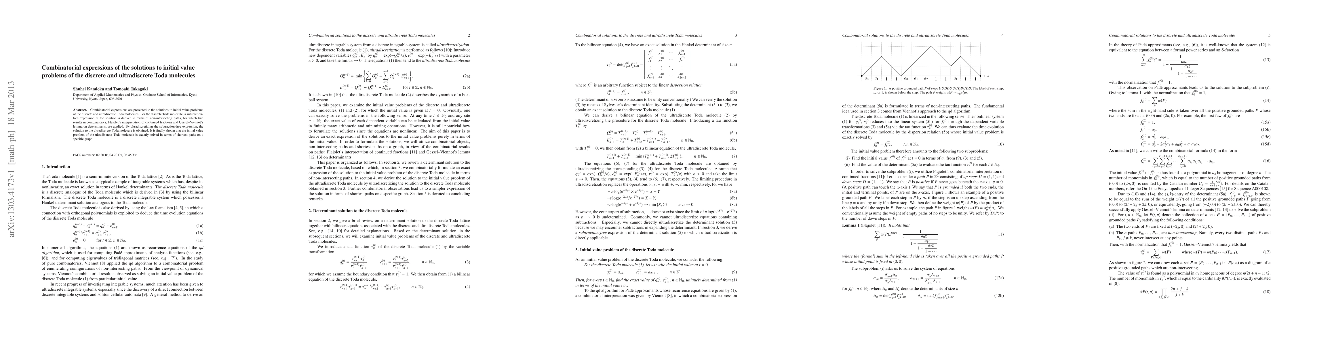 Combinatorial expressions are presented to the solutions to initial value problems of the discrete and ultradiscrete Toda molecules. For the discrete Toda molecule, a subtraction-free expression of the solution is derived in terms of non-intersecting paths, for which two results in combinatorics, Flajolet's interpretation of continued fractions and Gessel--Viennot's lemma on determinants, are applied. By ultradiscretizing the subtraction-free expression, the solution to the ultradiscrete Toda molecule is obtained. It is finally shown that the initial value problem of the ultradiscrete Toda molecule is exactly solved in terms of shortest paths on a specific graph.
