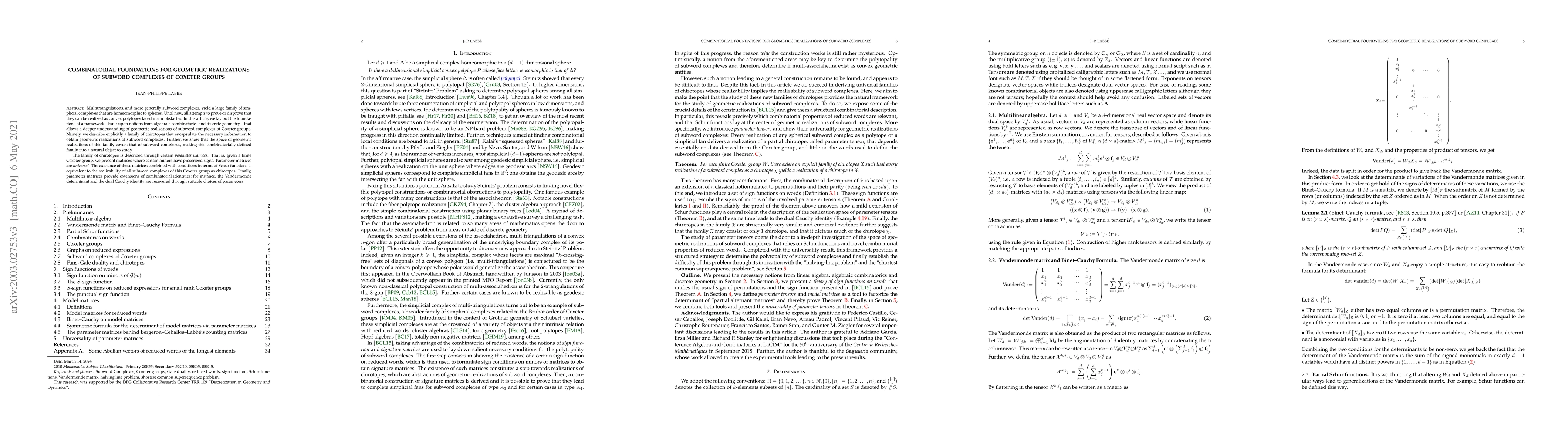 This paper establishes a combinatorial framework for realizing subword complexes of Coxeter groups geometrically, introducing a family of chirotopes defined by parameter matrices. It shows that these matrices, with specific minor sign conditions, ensure the realizability of subword complexes as convex polytopes.
