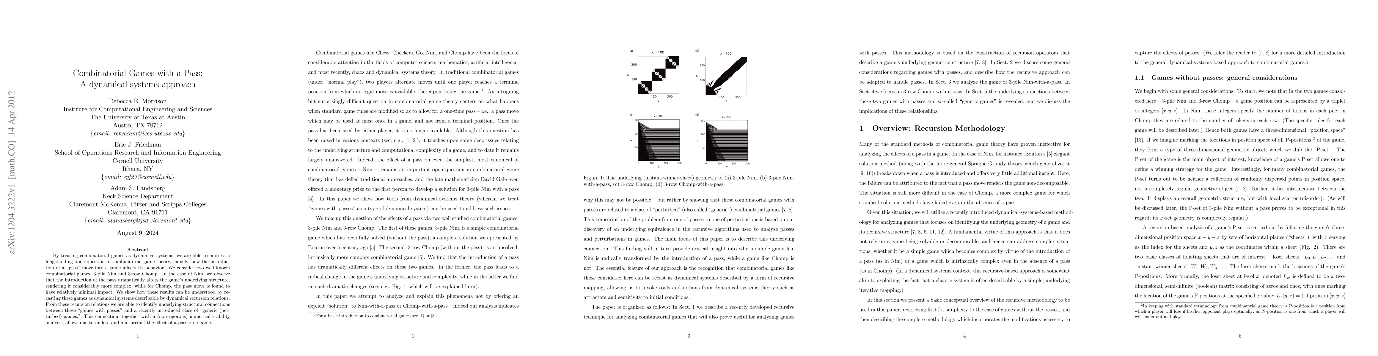 This paper explores how introducing a "pass" move affects combinatorial games by treating them as dynamical systems. It finds that pass alters 3-pile Nim significantly, while minimally impacting 3-row Chomp, and identifies structural connections between these games and a class of generic perturbed games.