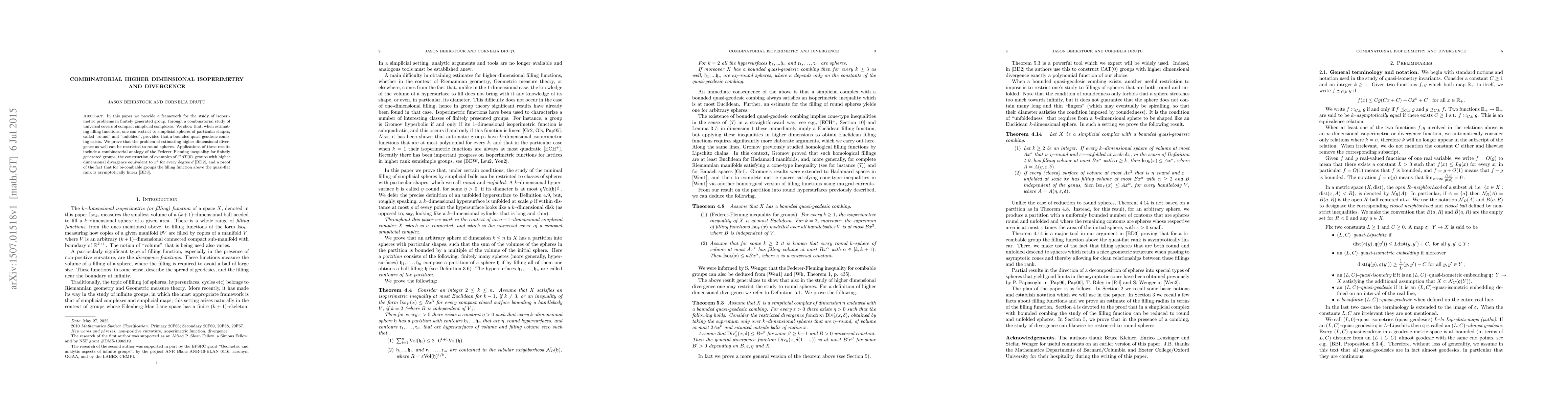 In this paper we provide a framework for the study of isoperimetric problems in finitely generated group, through a combinatorial study of universal covers of compact simplicial complexes. We show that, when estimating filling functions, one can restrict to simplicial spheres of particular shapes, called "round" and "unfolded", provided that a bounded quasi-geodesic combing exists. We prove that the problem of estimating higher dimensional divergence as well can be restricted to round spheres. Applications of these results include a combinatorial analogy of the Federer--Fleming inequality for finitely generated groups, the construction of examples of $CAT(0)$--groups with higher dimensional divergence equivalent to $x^d$ for every degree d [arXiv:1305.2994], and a proof of the fact that for bi-combable groups the filling function above the quasi-flat rank is asymptotically linear [Behrstock-Drutu].