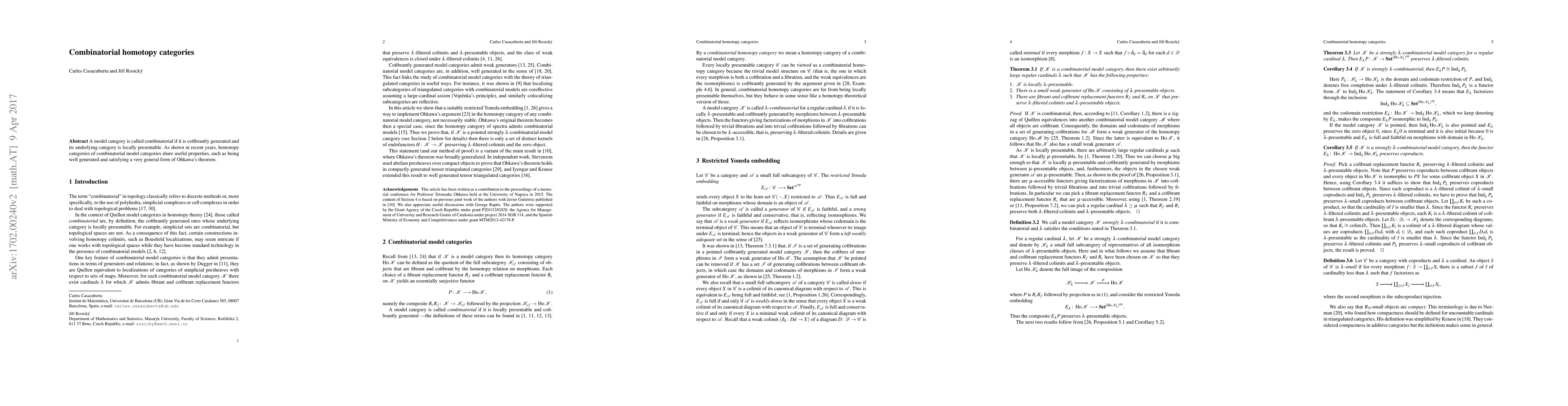 This paper explores combinatorial model categories, which are cofibrantly generated and locally presentable, and investigates the properties of their homotopy categories, showing they are well generated and satisfy a broad version of Ohkawa's theorem.