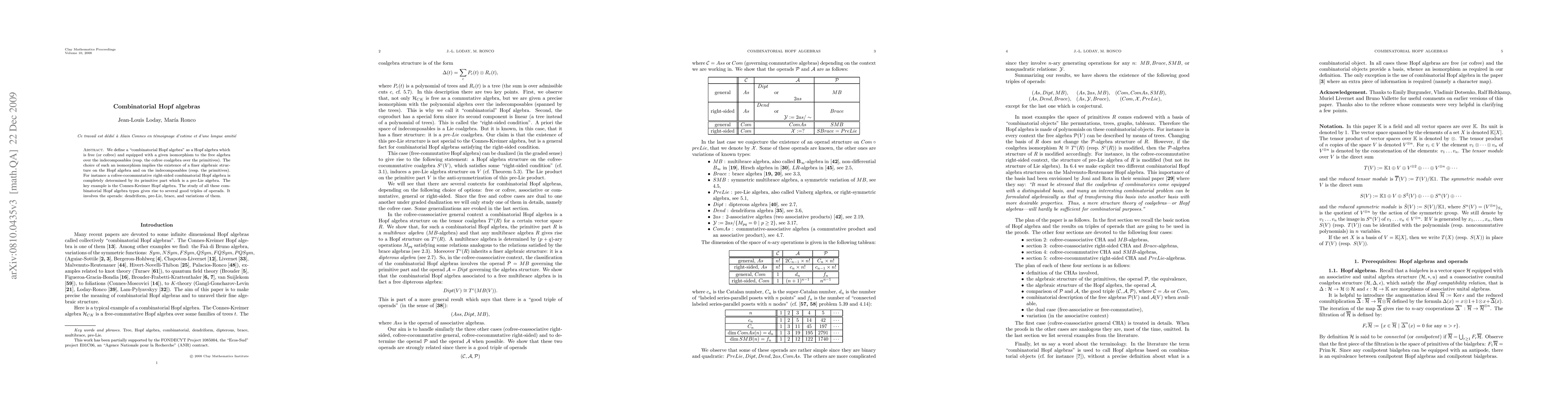 This paper introduces combinatorial Hopf algebras, defined as free or cofree Hopf algebras with specific isomorphisms to free algebras over indecomposables or cofree coalgebras over primitives. These structures lead to richer algebraic frameworks and are exemplified by the Connes-Kreimer Hopf algebra, revealing connections to operads like dendriform, pre-Lie, and brace.