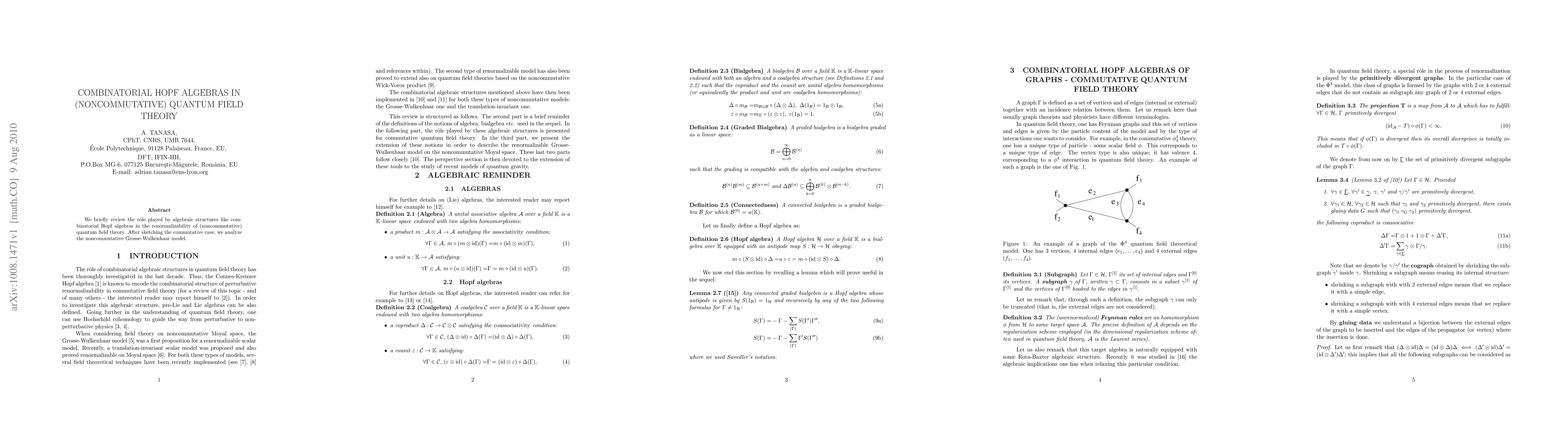 We briefly review the r\^ole played by algebraic structures like combinatorial Hopf algebras in the renormalizability of (noncommutative) quantum field theory. After sketching the commutative case, we analyze the noncommutative Grosse-Wulkenhaar model.
