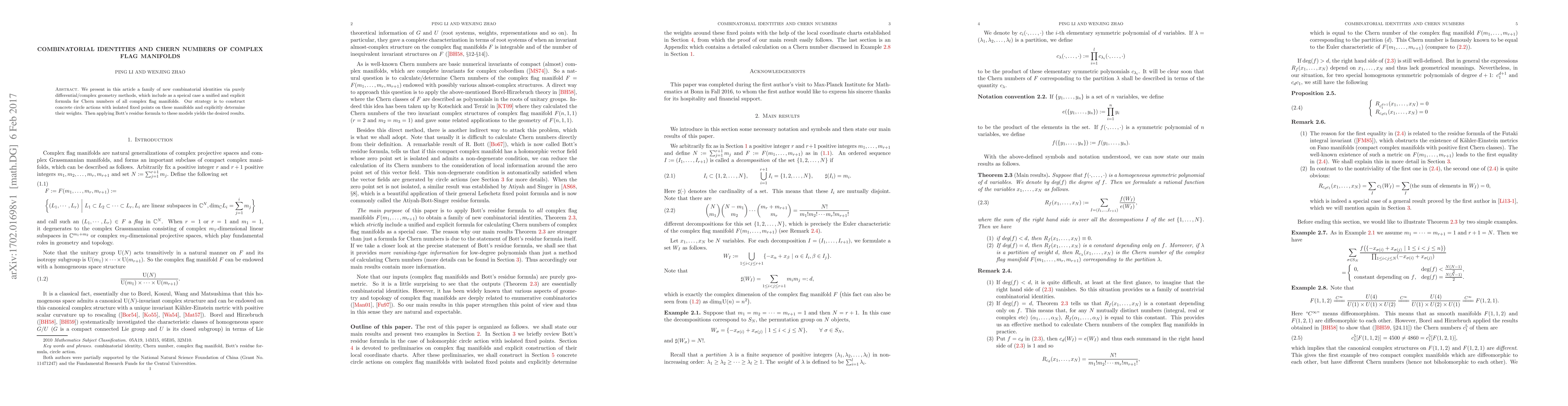 This paper introduces new combinatorial identities derived from complex geometry, specifically leveraging circle actions on complex flag manifolds to determine Chern numbers explicitly using Bott's residue formula.