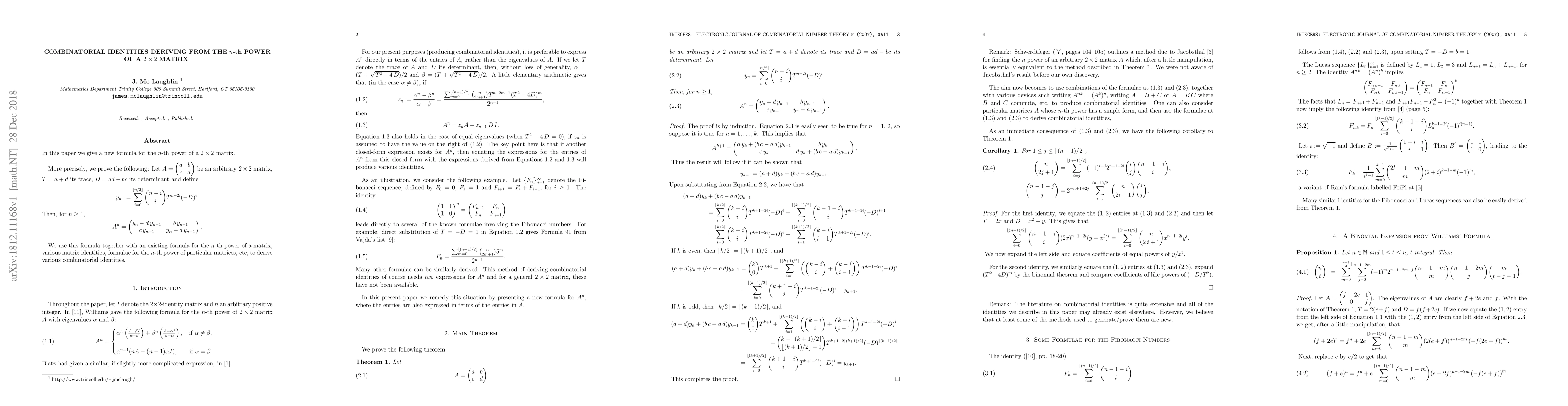 This paper presents a new formula for the $n$-th power of a $2\times2$ matrix, $A^n$, expressed in terms of the matrix's trace and determinant. It derives various combinatorial identities using this formula alongside existing matrix power formulas and identities.