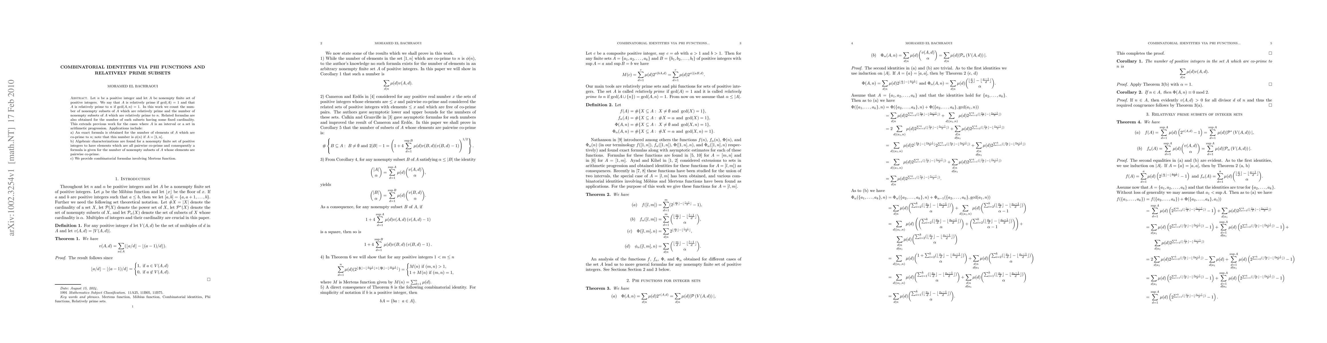 The paper presents novel combinatorial identities using phi functions and relatively prime subsets, extending previous work to more general finite sets and providing formulas for subsets with fixed cardinality.