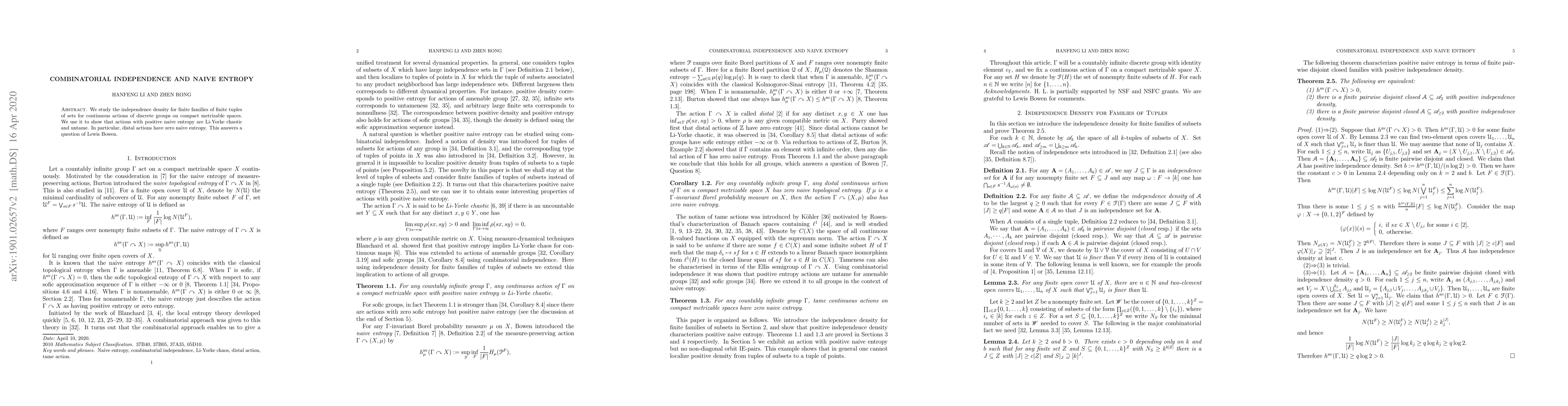 We study the independence density for finite families of finite tuples of sets for continuous actions of discrete groups on compact metrizable spaces. We use it to show that actions with positive naive entropy are Li-Yorke chaotic and untame. In particular, distal actions have zero naive entropy. This answers a question of Lewis Bowen.