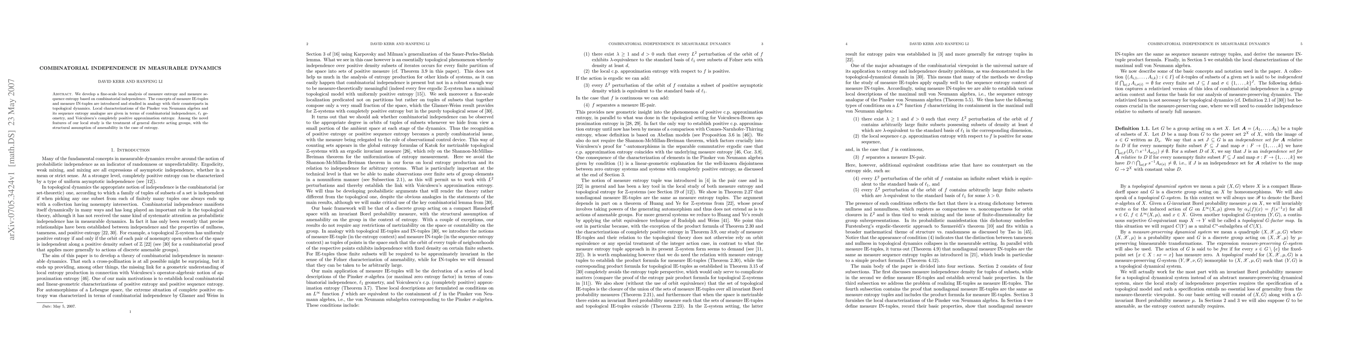 We develop a fine-scale local analysis of measure entropy and measure sequence entropy based on combinatorial independence. The concepts of measure IE-tuples and measure IN-tuples are introduced and studied in analogy with their counterparts in topological dynamics. Local characterizations of the Pinsker von Neumann algebra and its sequence entropy analogue are given in terms of combinatorial independence, l_1 geometry, and Voiculescu's completely positive approximation entropy. Among the novel features of our local study is the treatment of general discrete acting groups, with the structural assumption of amenability in the case of entropy.