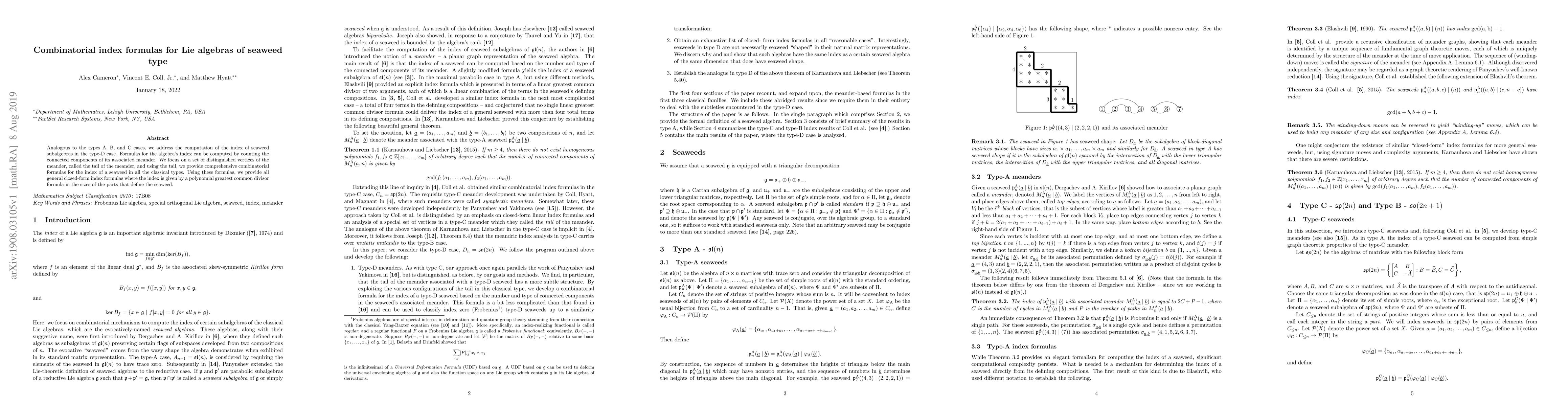 This paper develops combinatorial index formulas for Lie algebras of seaweed type, specifically for type-D cases. It uses the concept of meander connected components and a distinguished vertex set, known as the tail, to derive comprehensive formulas for the index, expressed as polynomial greatest common divisors of seaweed defining sizes.