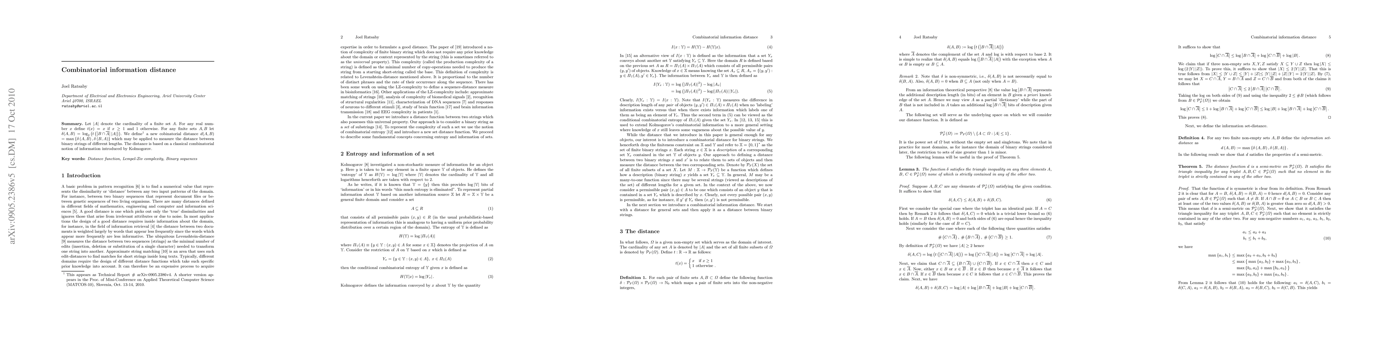 Let $|A|$ denote the cardinality of a finite set $A$. For any real number $x$ define $t(x)=x$ if $x\geq1$ and 1 otherwise. For any finite sets $A,B$ let $\delta(A,B)$ $=$ $\log_{2}(t(|B\cap\bar{A}||A|))$. We define {This appears as Technical Report # arXiv:0905.2386v4. A shorter version appears in the {Proc. of Mini-Conference on Applied Theoretical Computer Science (MATCOS-10)}, Slovenia, Oct. 13-14, 2010.} a new cobinatorial distance $d(A,B)$ $=$ $\max\{\delta(A,B),\delta(B,A)\} $ which may be applied to measure the distance between binary strings of different lengths. The distance is based on a classical combinatorial notion of information introduced by Kolmogorov.