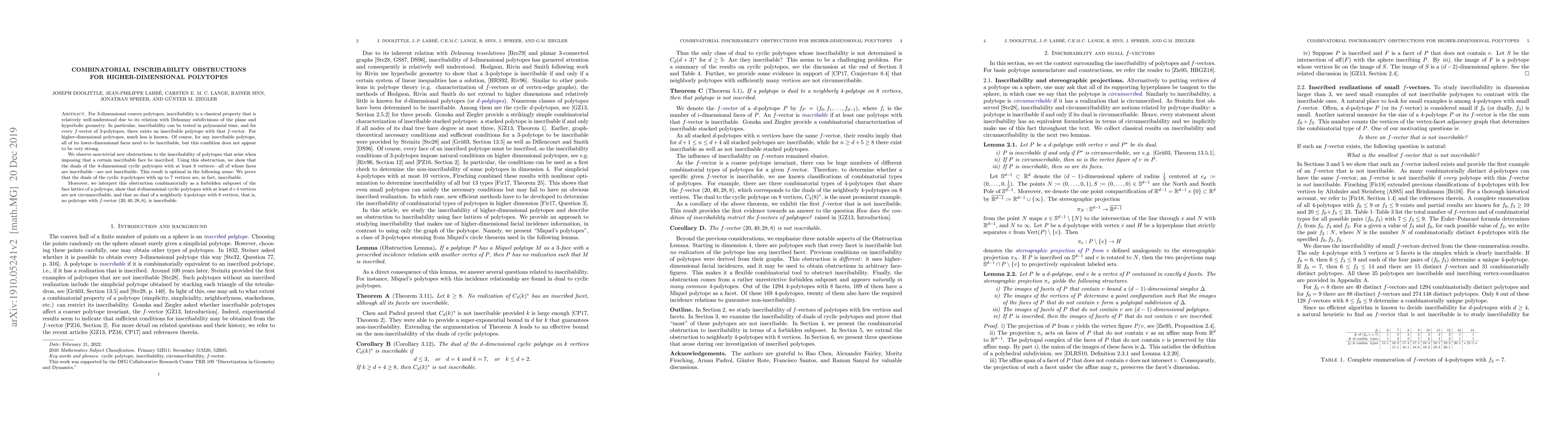 This paper identifies new combinatorial obstructions to inscribability in higher-dimensional polytopes, particularly demonstrating that duals of 4-dimensional cyclic polytopes with at least 8 vertices are non-inscribable. It also interprets these obstructions as forbidden subposets in the polytope’s face lattice and proves related results for cyclic and neighborly polytopes.
