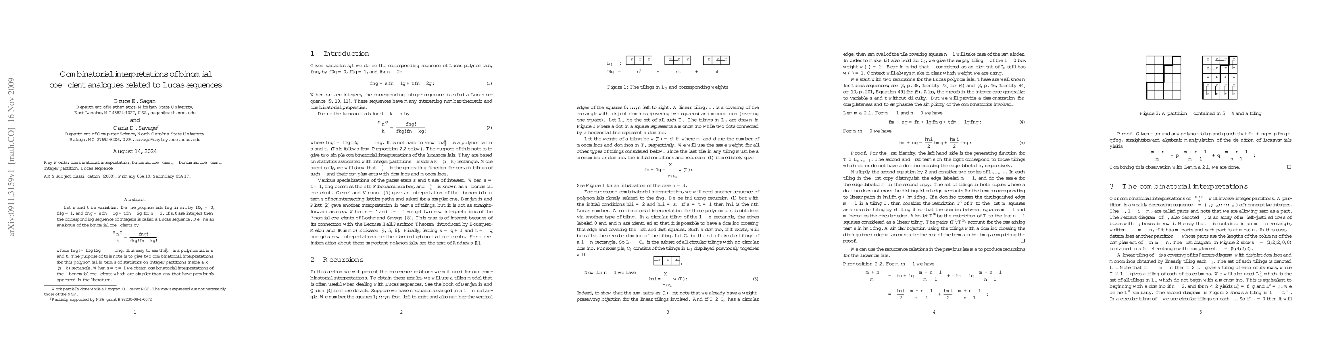 Let s and t be variables. Define polynomials {n} in s, t by {0}=0, {1}=1, and {n}=s{n-1}+t{n-2} for n >= 2. If s, t are integers then the corresponding sequence of integers is called a Lucas sequence. Define an analogue of the binomial coefficients by C{n,k}={n}!/({k}!{n-k}!) where {n}!={1}{2}...{n}. It is easy to see that C{n,k} is a polynomial in s and t. The purpose of this note is to give two combinatorial interpretations for this polynomial in terms of statistics on integer partitions inside a k by n-k rectangle. When s=t=1 we obtain combinatorial interpretations of the fibonomial coefficients which are simpler than any that have previously appeared in the literature.