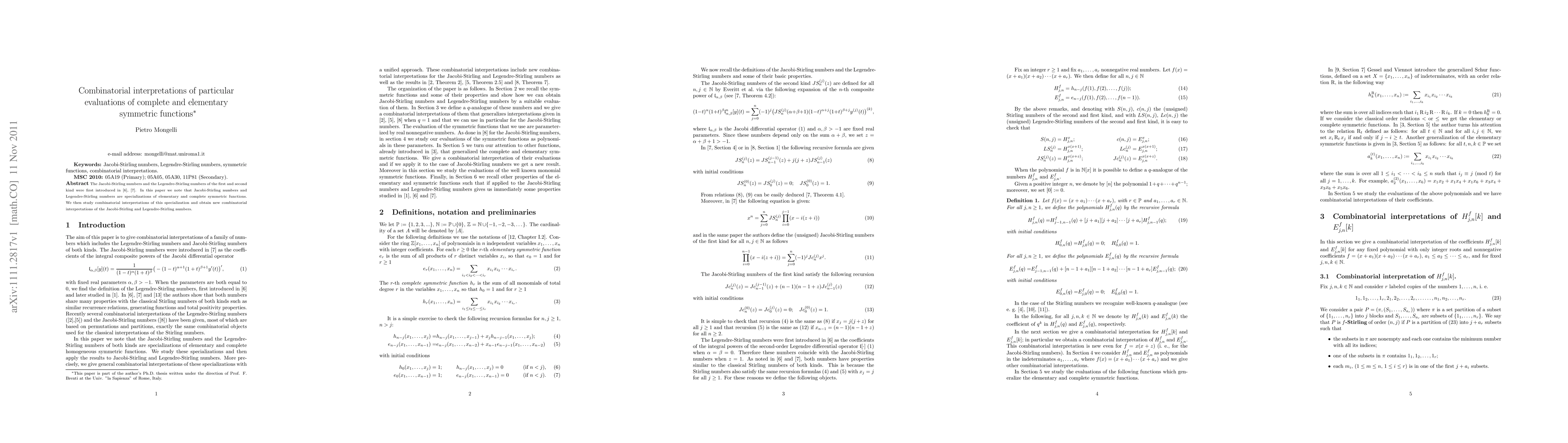 This paper explores combinatorial interpretations for Jacobi-Stirling and Legendre-Stirling numbers, which are special cases of elementary and complete symmetric functions. New combinatorial interpretations are derived for these numbers.