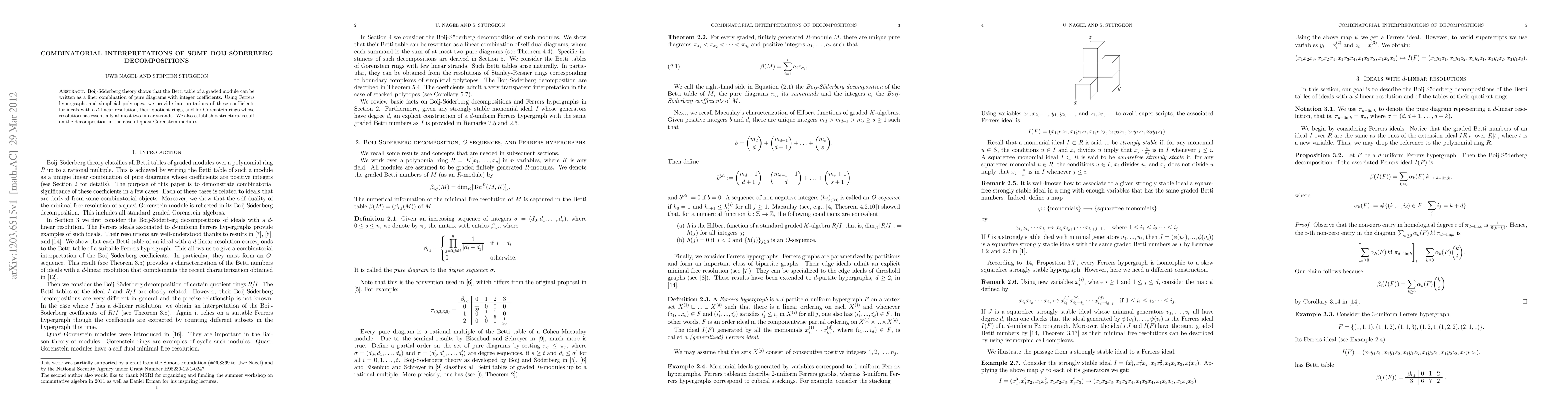 Boij-S\"oderberg theory shows that the Betti table of a graded module can be written as a liner combination of pure diagrams with integer coefficients. Using Ferrers hypergraphs and simplicial polytopes, we provide interpretations of these coefficients for ideals with a d-linear resolution, their quotient rings, and for Gorenstein rings whose resolution has essentially at most two linear strands. We also establish a structural result on the decomposition in the case of quasi-Gorenstein modules.