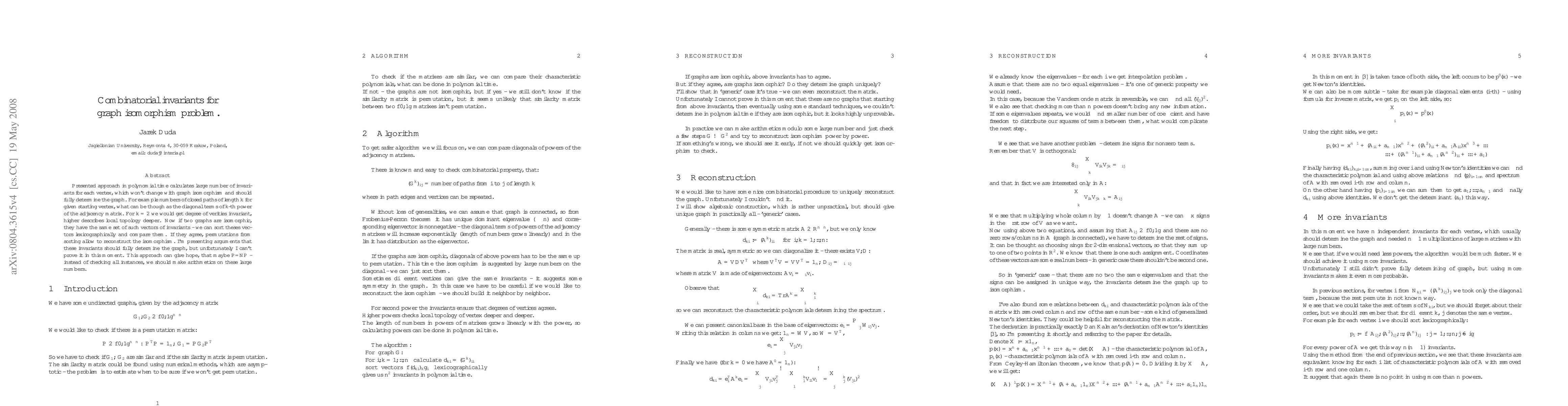 This paper proposes a polynomial-time method to compute numerous combinatorial invariants for determining graph isomorphism, such as closed path counts from vertices, which remain unchanged under graph isomorphism. Although the invariants' sufficiency is argued, they are not proven, yet they offer a hopeful alternative to exhaustive checking, potentially hinting at P=NP.