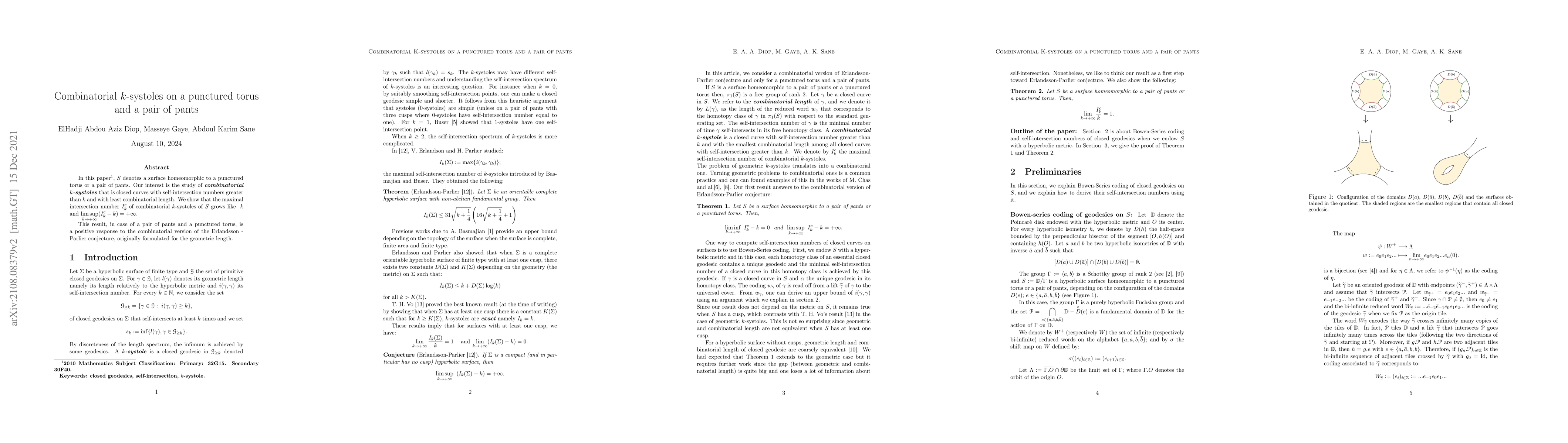In this paper, $S$ denotes a surface homeomorphic to a punctured torus or a pair of pants. Our interest is the study of \emph{\textbf{combinatorial $k$-systoles}} that is closed curves with self-intersection numbers greater than $k$ and with least combinatorial length. We show that the maximal intersection number $I^c_k$ of combinatorial $k$-systoles of $S$ grows like $k$ and $\underset{k\rightarrow+\infty}{\limsup}(I^c_k-k)=+\infty$. This result, in case of a pair of pants and a punctured torus, is a positive response to the combinatorial version of the Erlandsson - Parlier conjecture, originally formulated for the geometric length.