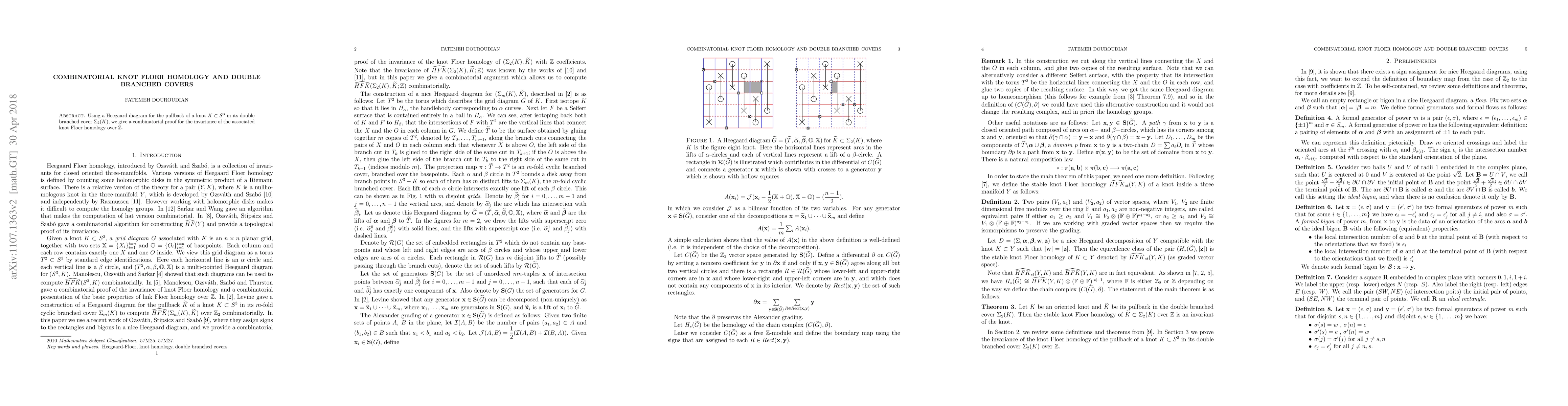 This paper presents a combinatorial proof demonstrating the invariance of knot Floer homology over $\mathbb{Z}$ by utilizing a Heegaard diagram for the cyclic double branched cover of a knot $K \subset S^3$. The focus is on the structure within the branched cover's pullback.