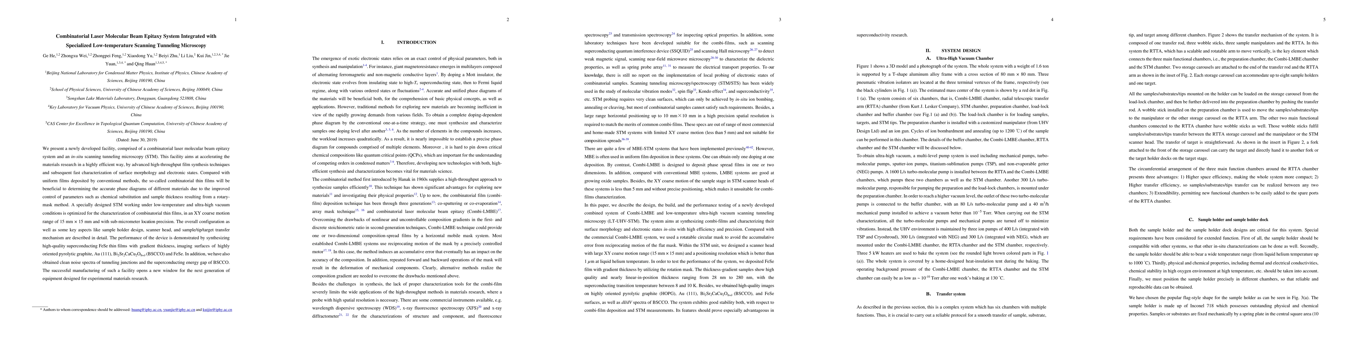 We present a newly developed facility, comprised of a combinatorial laser molecular beam epitaxy system and an in-situ scanning tunneling microscopy (STM). This facility aims at accelerating the materials research in a highly efficient way, by advanced high-throughput film synthesis techniques and subsequent fast characterization of surface morphology and electronic states. Compared with uniform films deposited by conventional methods, the so-called combinatorial thin films will be beneficial to determining the accurate phase diagrams of different materials due to the improved control of parameters such as chemical substitution and sample thickness resulting from a rotarymask method. A specially designed STM working under low-temperature and ultra-high vacuum conditions is optimized for the characterization of combinatorial thin films, in an XY coarse motion range of 15 mm $\times$ 15 mm and with sub-micrometer location precision. The overall configuration as well as some key aspects like sample holder design, scanner head, and sample/tip/target transfer mechanism are described in detail. The performance of the device is demonstrated by synthesizing high-quality superconducting FeSe thin films with gradient thickness, imaging surfaces of highly oriented pyrolytic graphite, Au (111), Bi2Sr2CaCu2O8+{\delta} (BSCCO) and FeSe. In addition, we have also obtained clean noise spectra of tunneling junctions and the superconducting energy gap of BSCCO. The successful manufacturing of such a facility opens a new window for the next generation of equipment designed for experimental materials research.