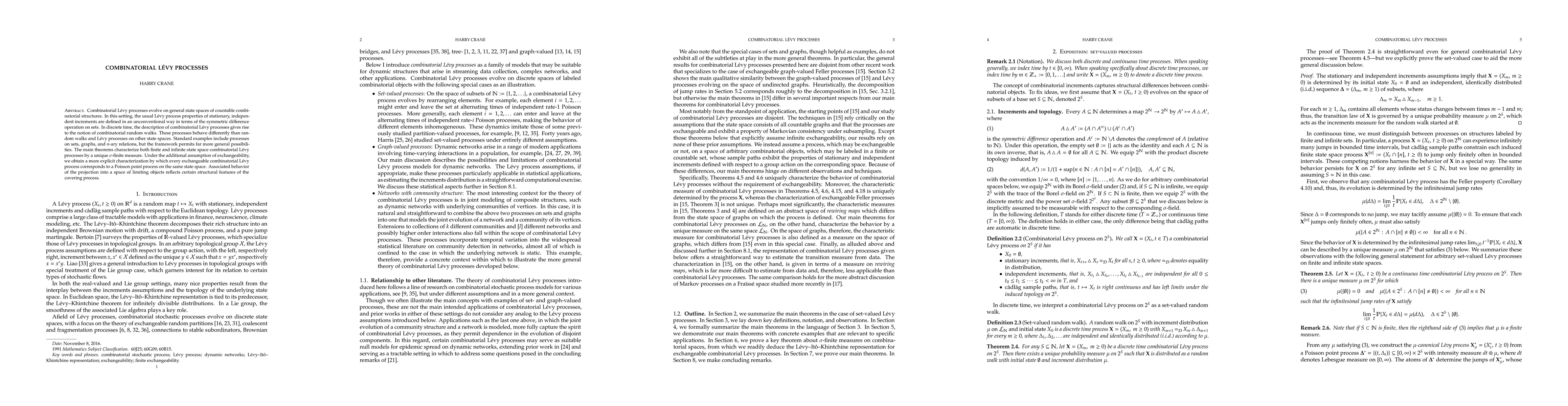 This paper explores combinatorial Lévy processes defined on countable combinatorial structures, using symmetric difference operations. It characterizes these processes through unique sigma-finite measures and connects exchangeable processes to Poisson point processes, while highlighting their distinct behavior compared to conventional Lévy processes.